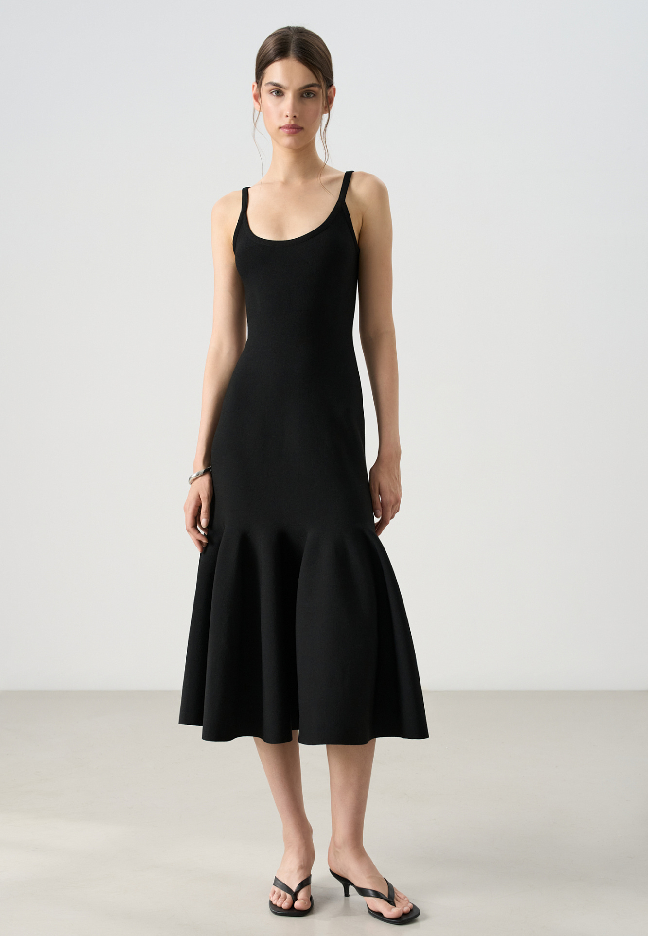 Трикотажное платье длины миди из вискозы. Модель приталенного силуэта, с расклешенной юбкой с мягкими складками, без рукавов, на узких бретелях. Застежка на молнию сзади.