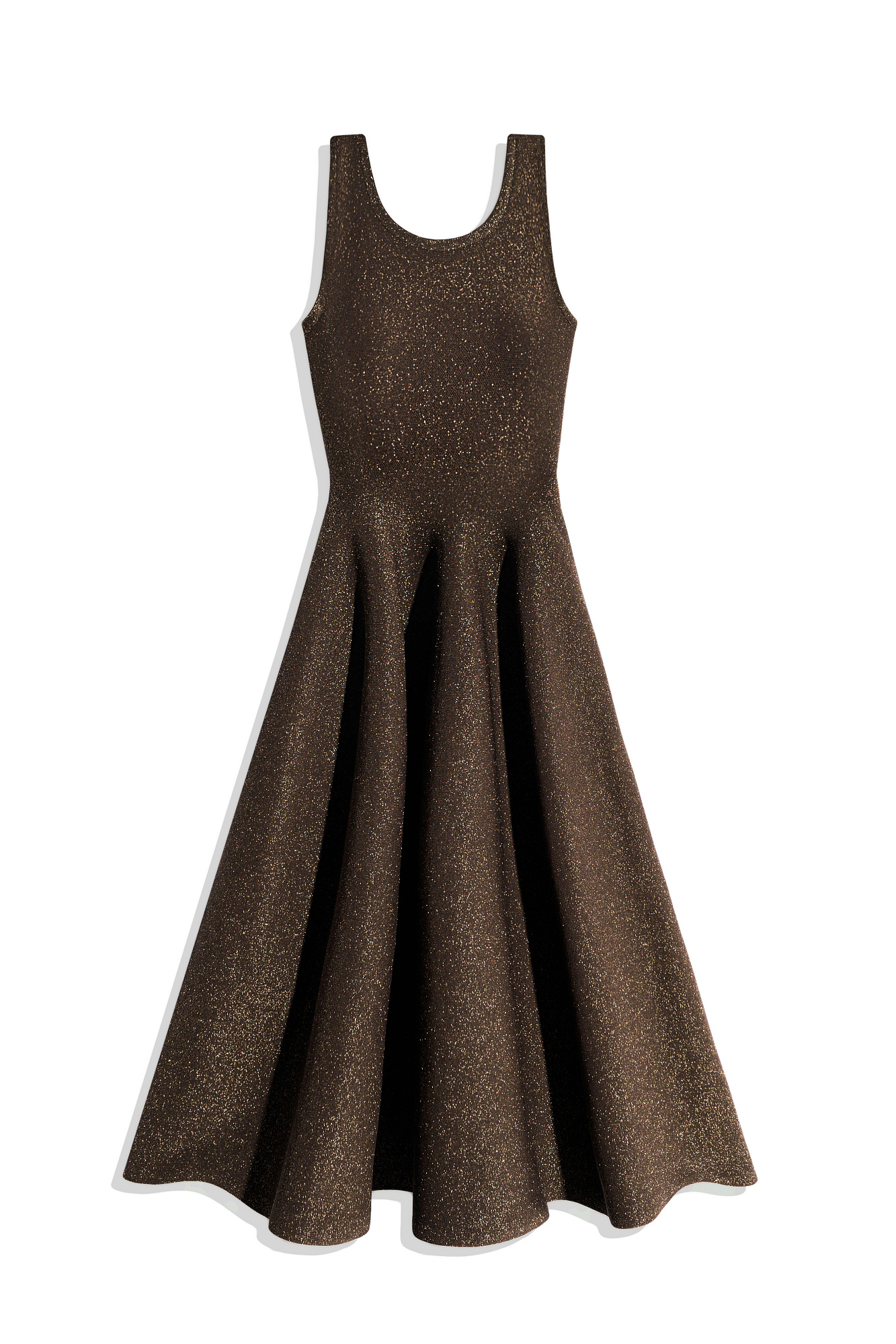 Трикотажное платье длины миди с люрексом. Модель по фигуре с юбкой, расклешенной от талии, без рукавов, на широких бретельках.