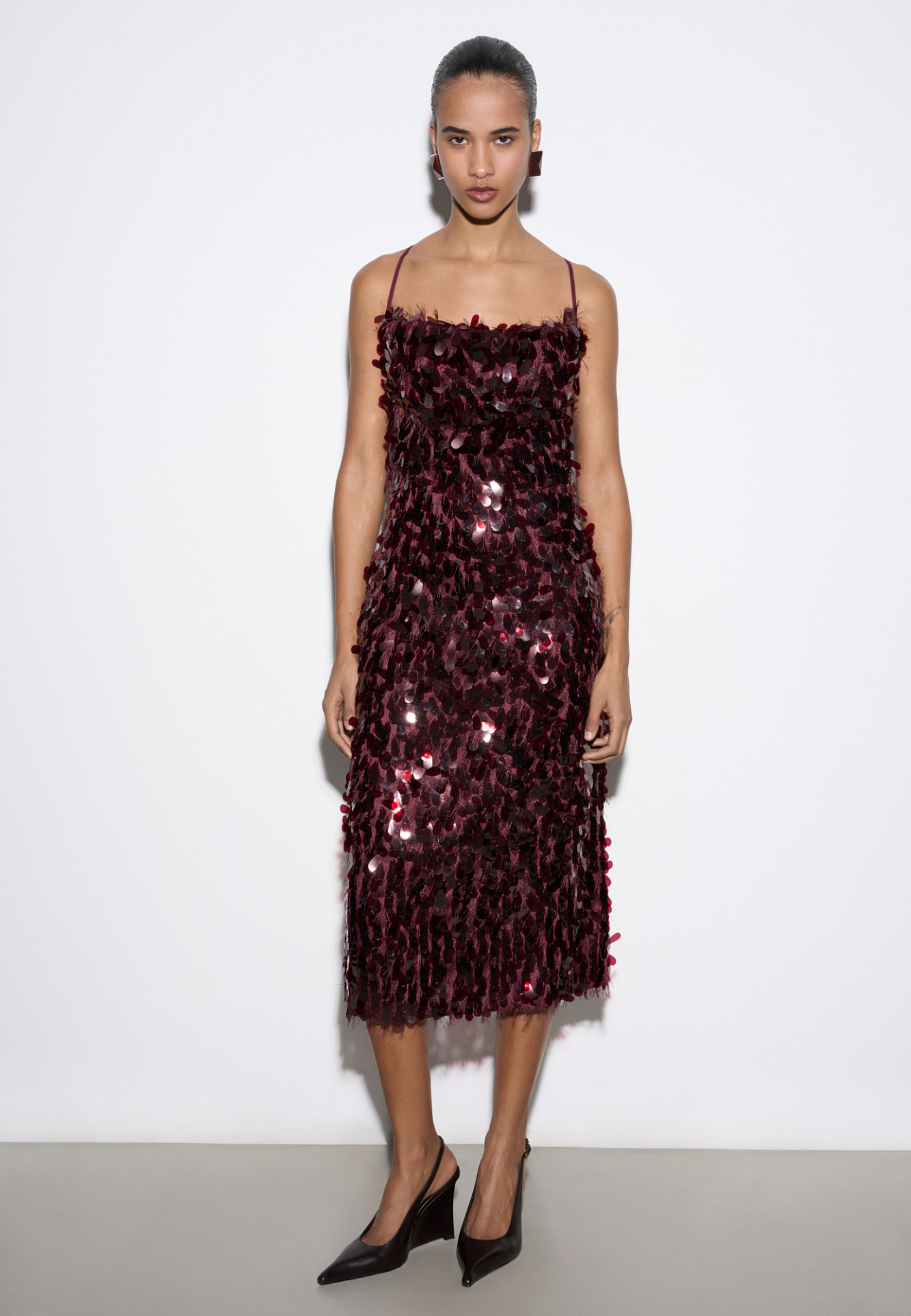 Вечернее платье-футляр длины миди, декорированное пайетками и бахромой. Модель по фигуре на тонких регулируемых бретельках.