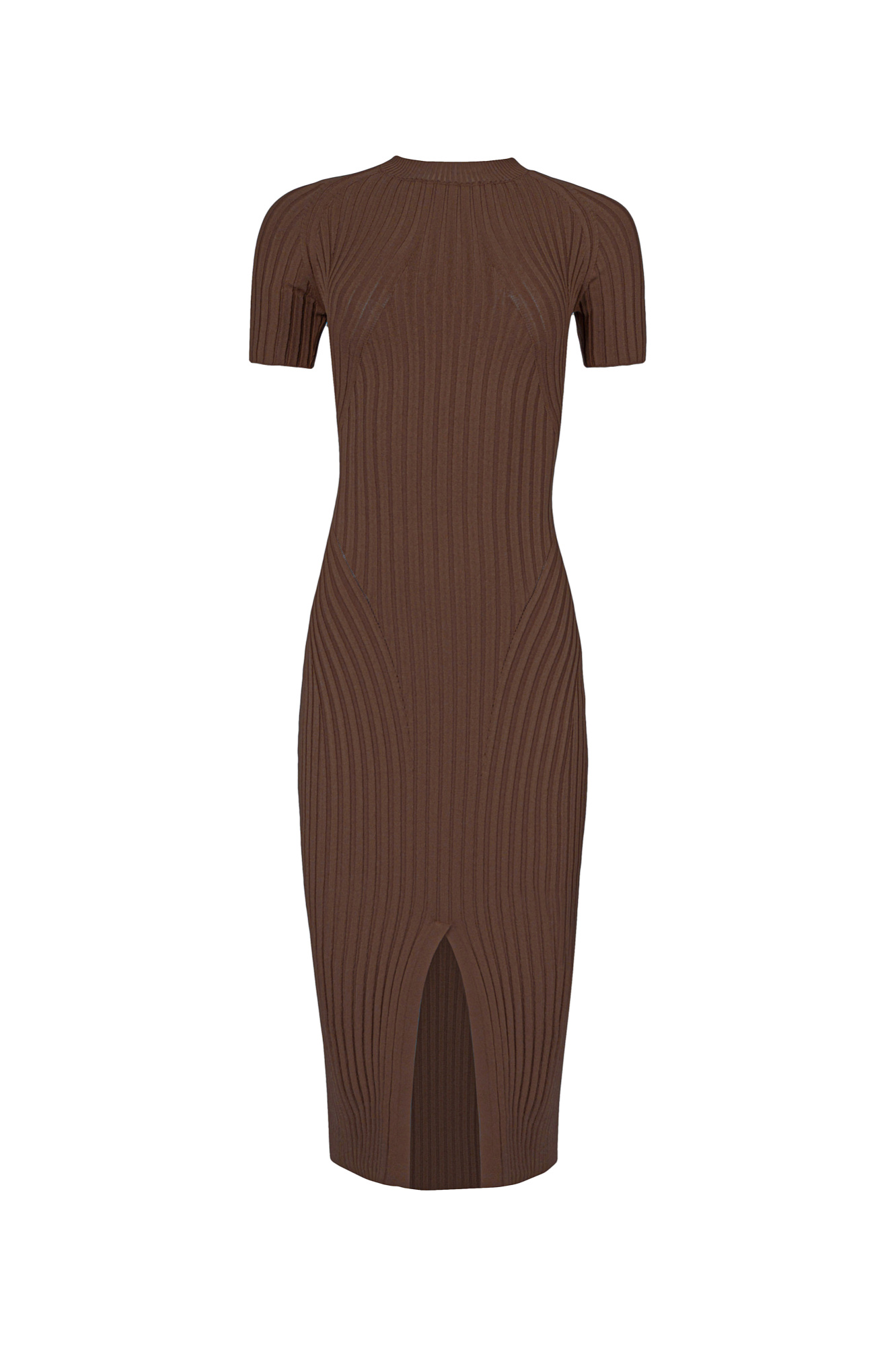 Трикотажное платье по фигуре в широкий рубчик с перекрутом на спине и разрезом спереди.