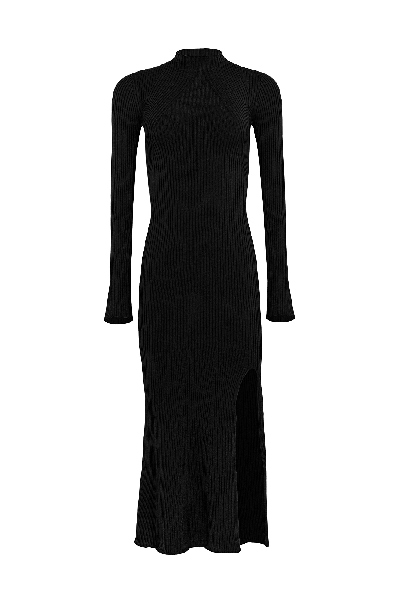 Цельновязаное платье из вискозы, длинные рукава с разрезом расширенные к запястью. Элегантный разрез на левой ноге.