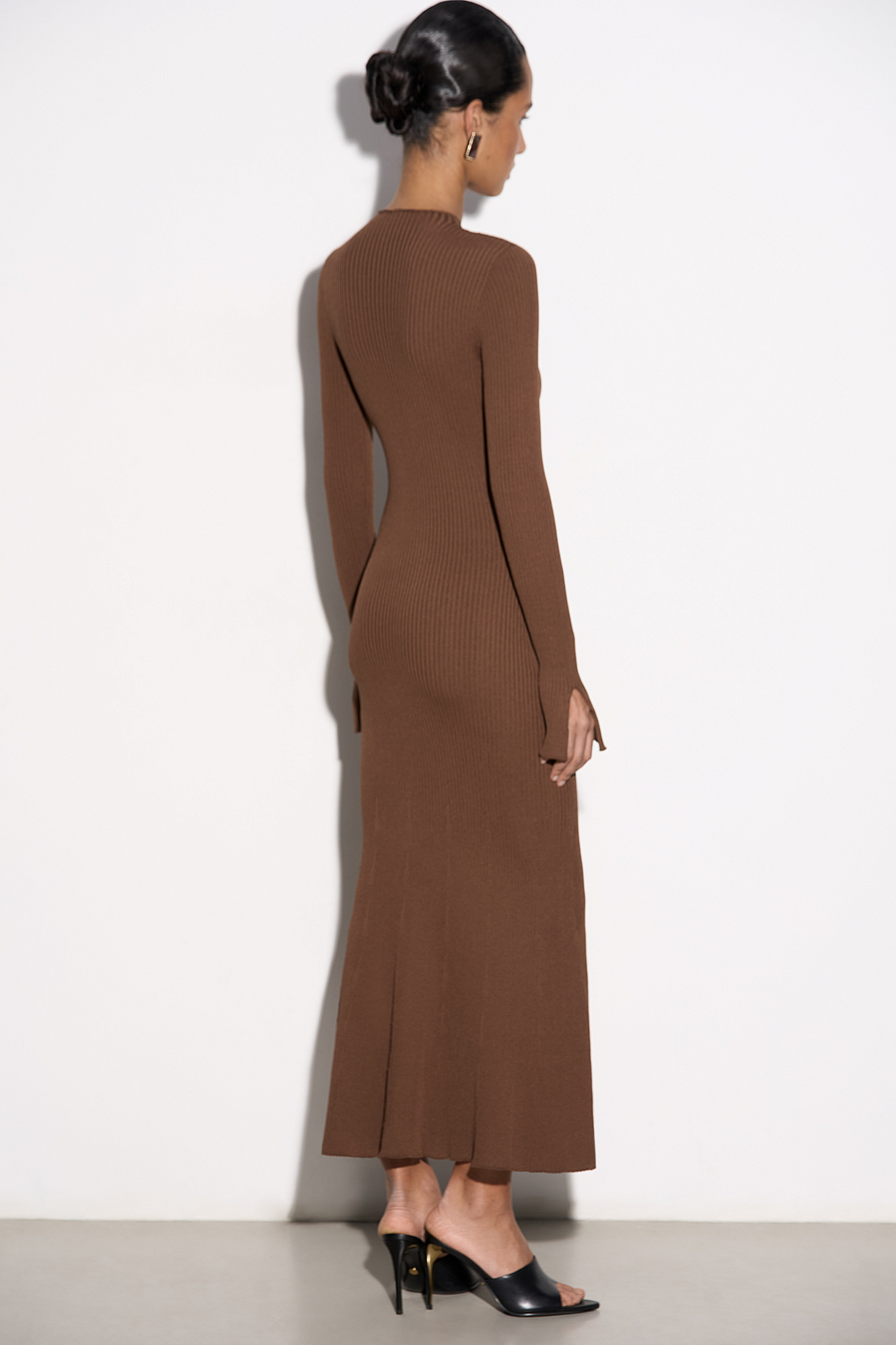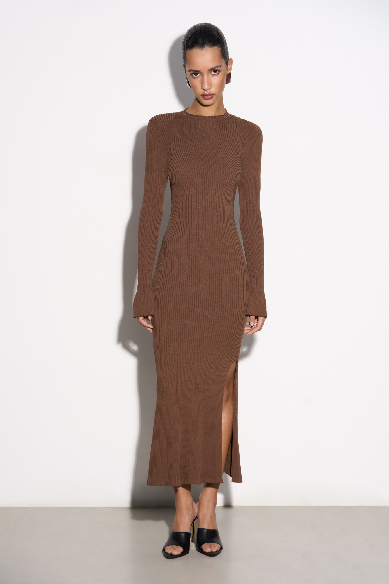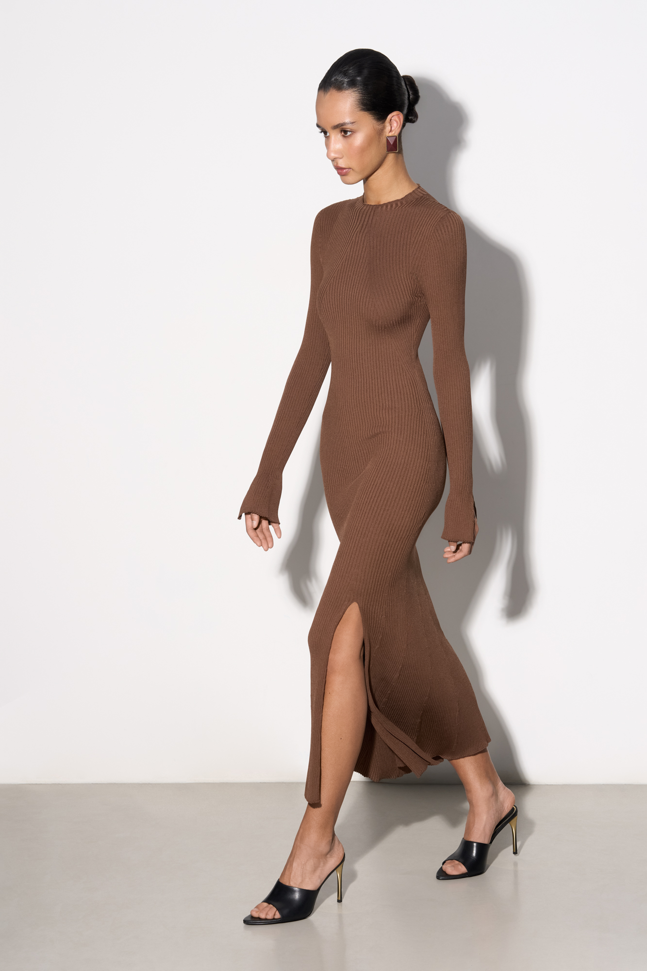 Цельновязаное платье из вискозы, длинные рукава с разрезом расширенные к запястью. Элегантный разрез на левой ноге.