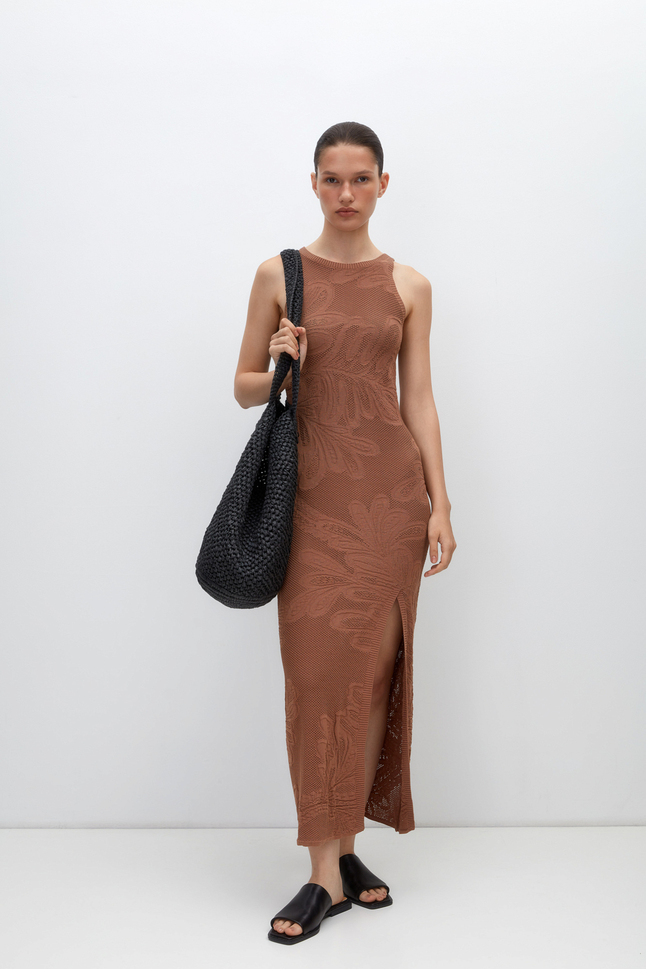 Трикотажное платье длины миди из органического хлопка. Модель приталенного силуэта, без рукавов. круглым вырезом горловины, разрезом спереди и шнуровкой на спине. Изделие декорировано растительным орнаментом.