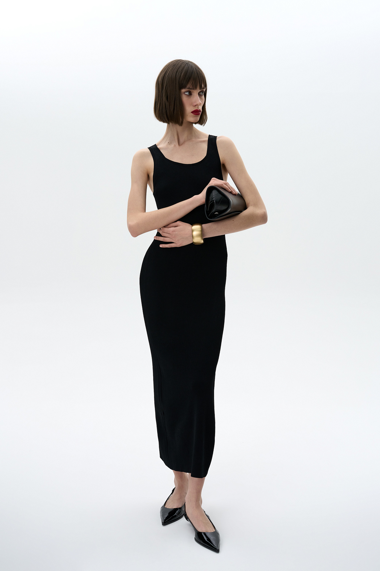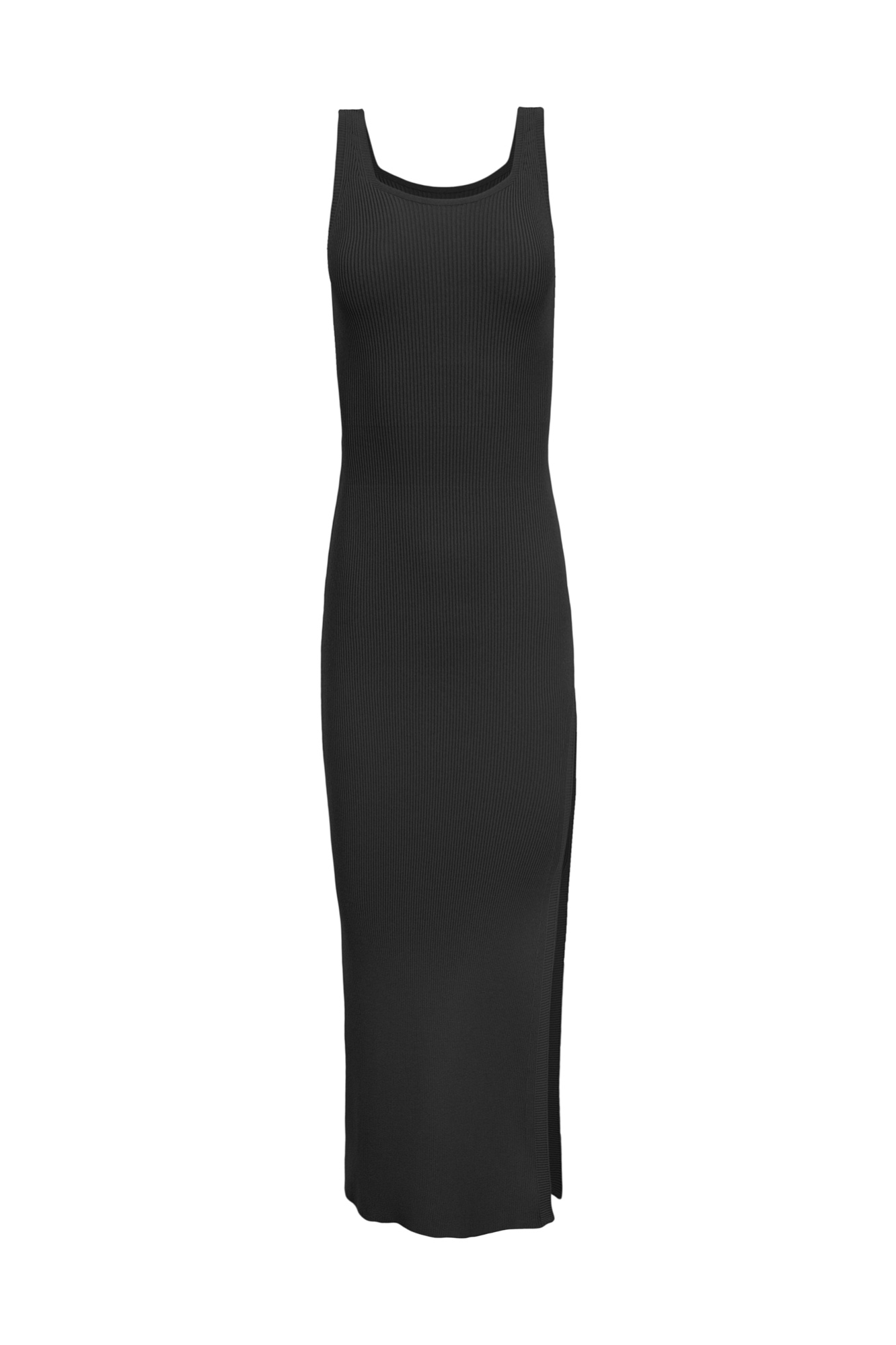 Трикотажное платье длины миди из вискозы в рубчик. Модель приталенного силуэта, без рукавов, на широких бретельках, с неглубоким U-вырезом и разрезом от середины бедра.