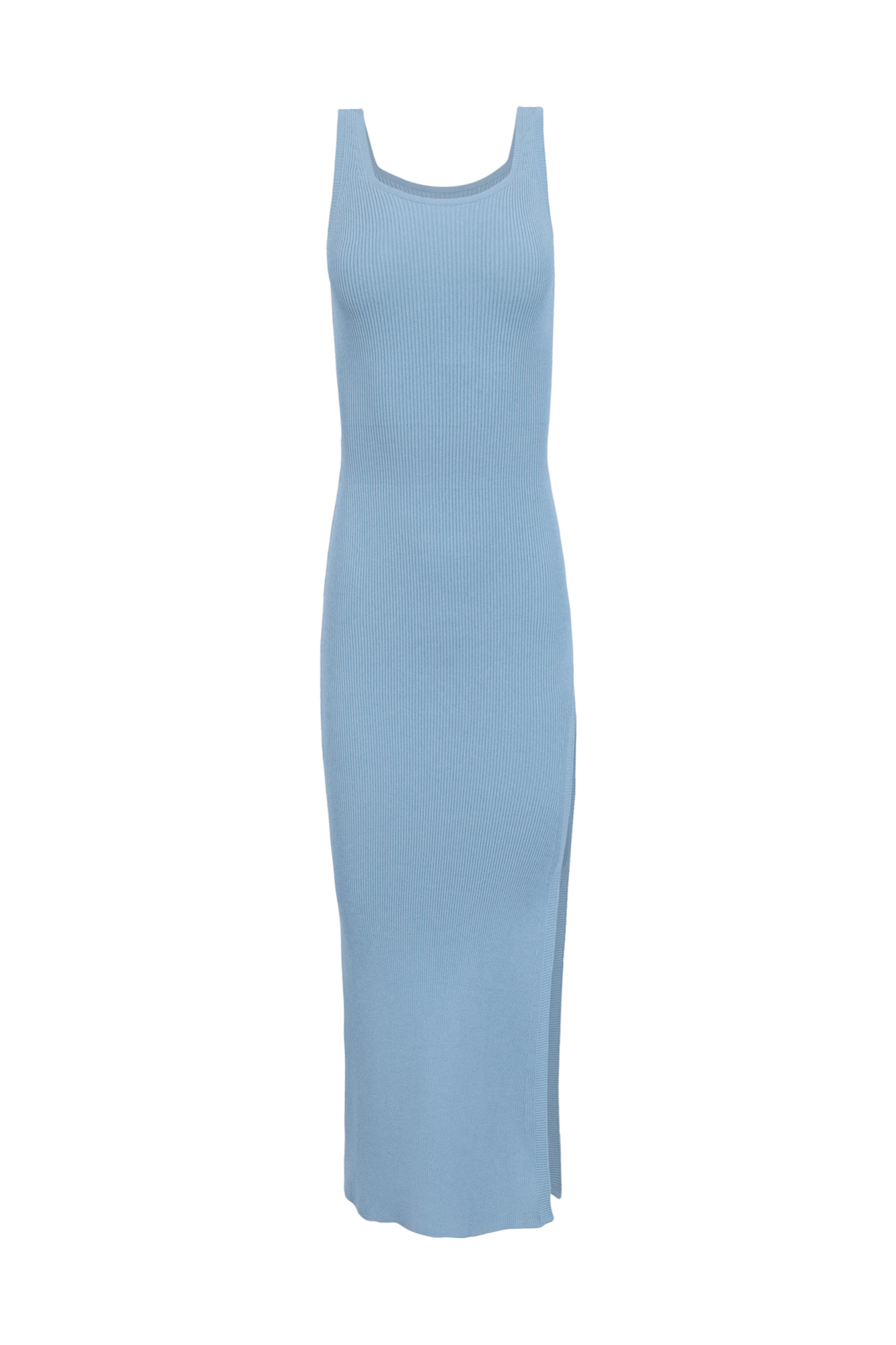 Трикотажное платье длины миди из вискозы в рубчик. Модель приталенного силуэта, без рукавов, на широких бретельках, с неглубоким U-вырезом и разрезом от середины бедра.