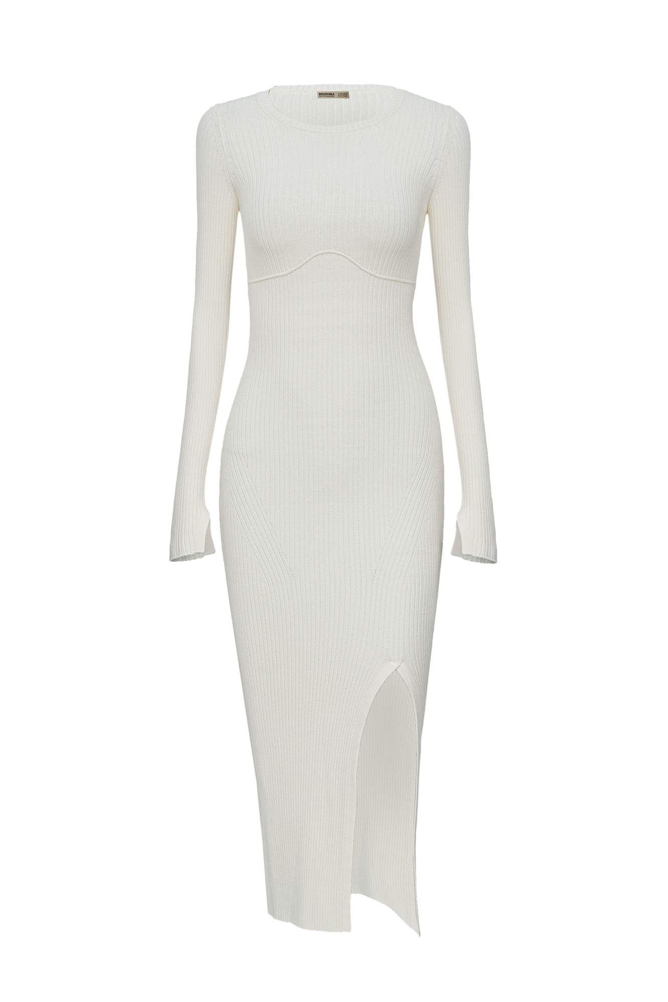 Трикотажное платье из мягкой вискозы с длинными рукавами. Фигурный кант под грудью и разрез сбоку.
