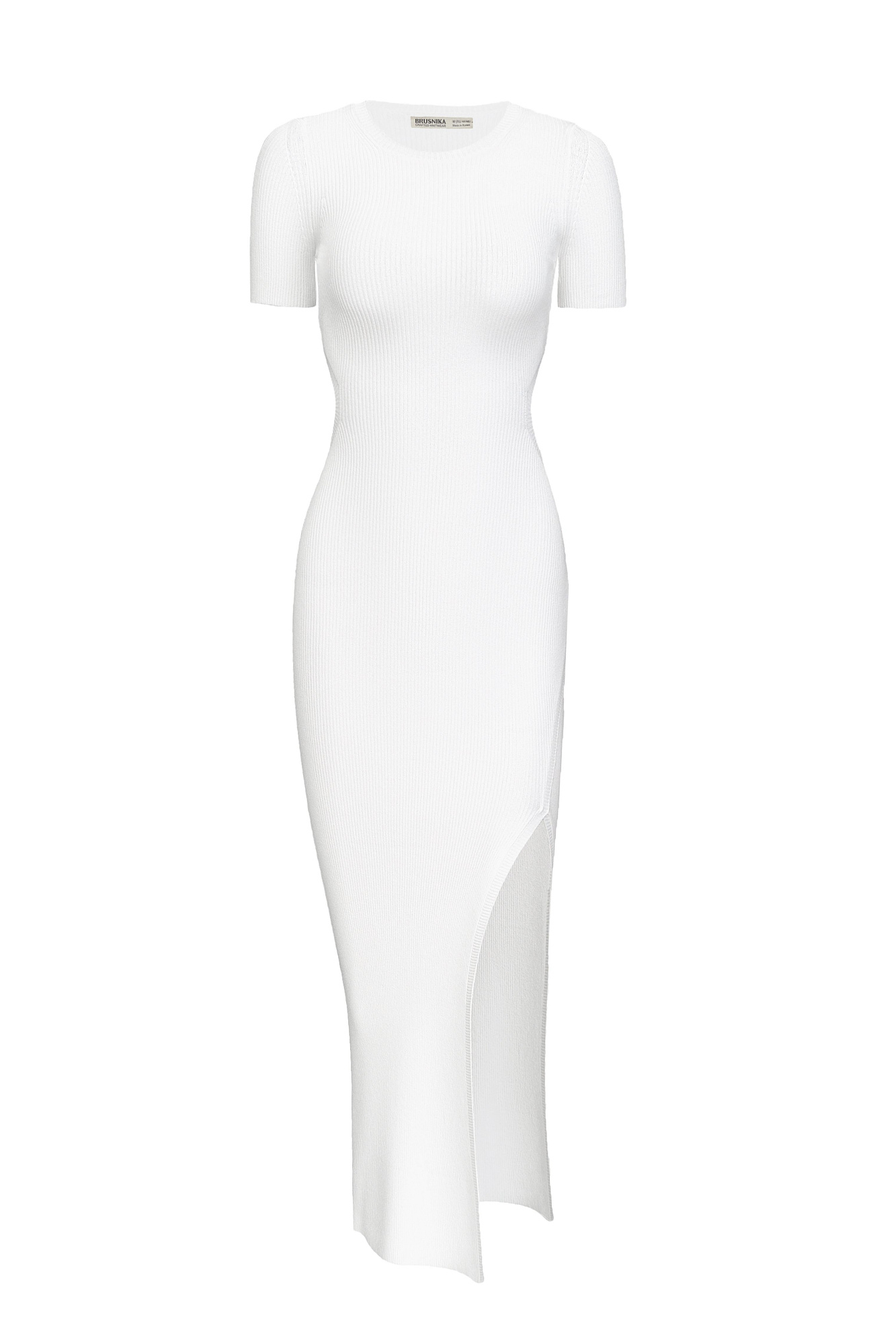 Облегающее трикотажное платье длины миди из вискозы. Модель приталенного силуэта, с короткими рукавами, круглым вырезом горловины, вырезом на спине и высоким разрезом сбоку.