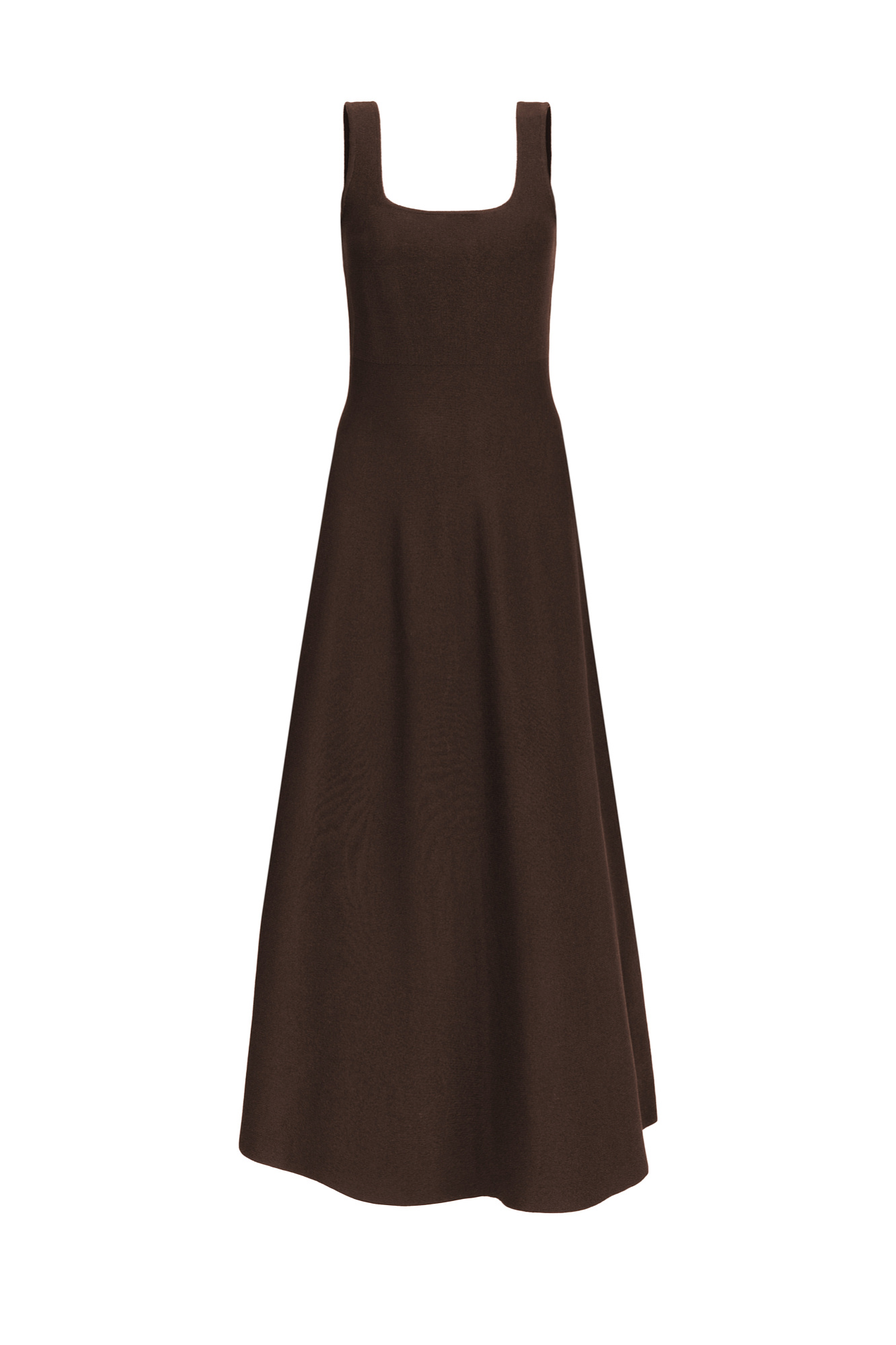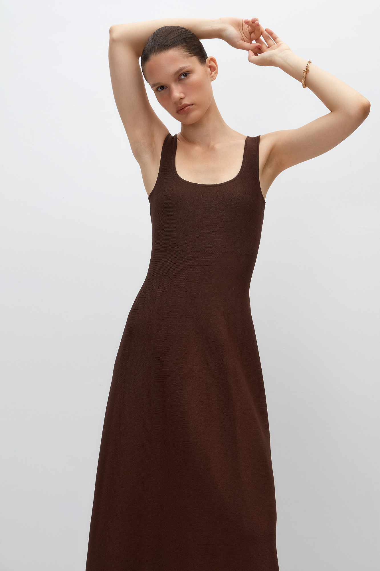 Трикотажное платье длины миди из плотной вискозы. Модель без рукавов, на широких бретелях и юбкой А-силуэта. Застежка на молнию сзади.