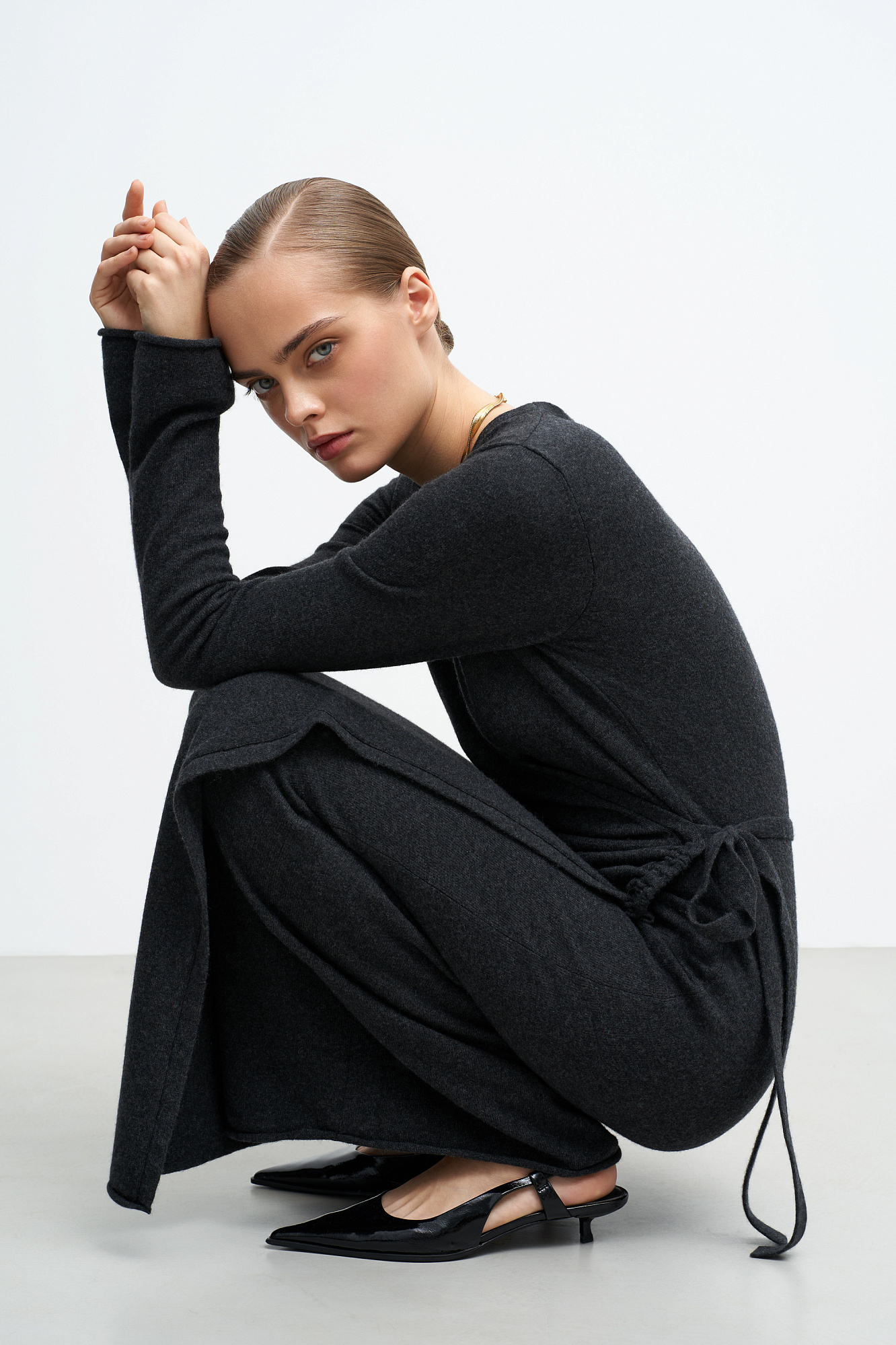 Трикотажное платье на запах из шерсти и кашемира. Модель приталенного силуэта с V-образным вырезом, длинными рукавами и кулиской на талии. Подол платья и манжеты рукавов декорированы валиками.
