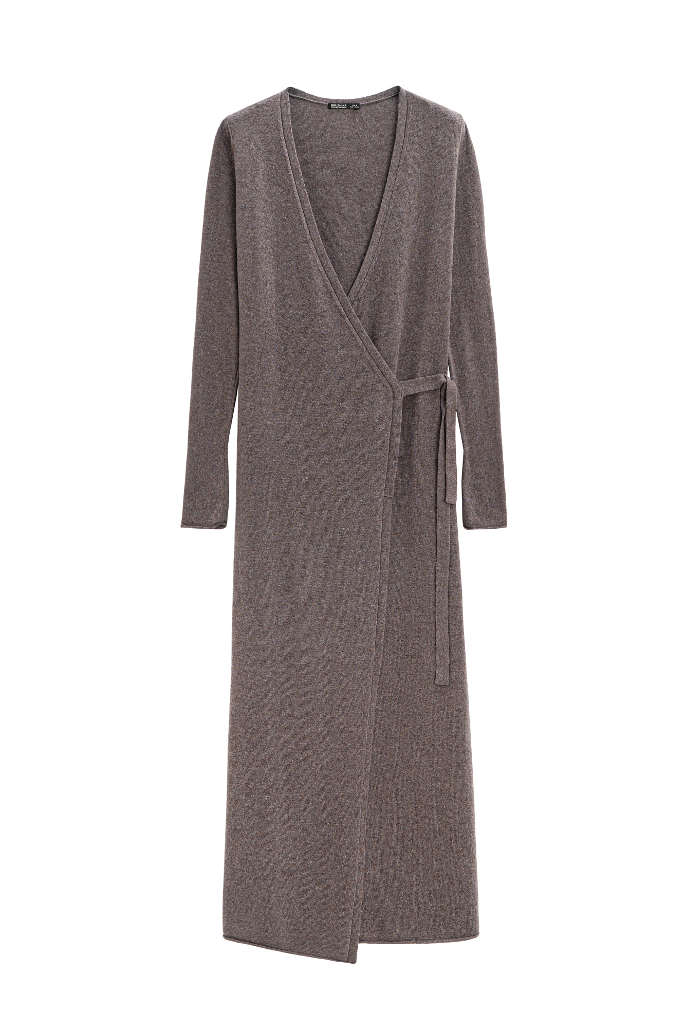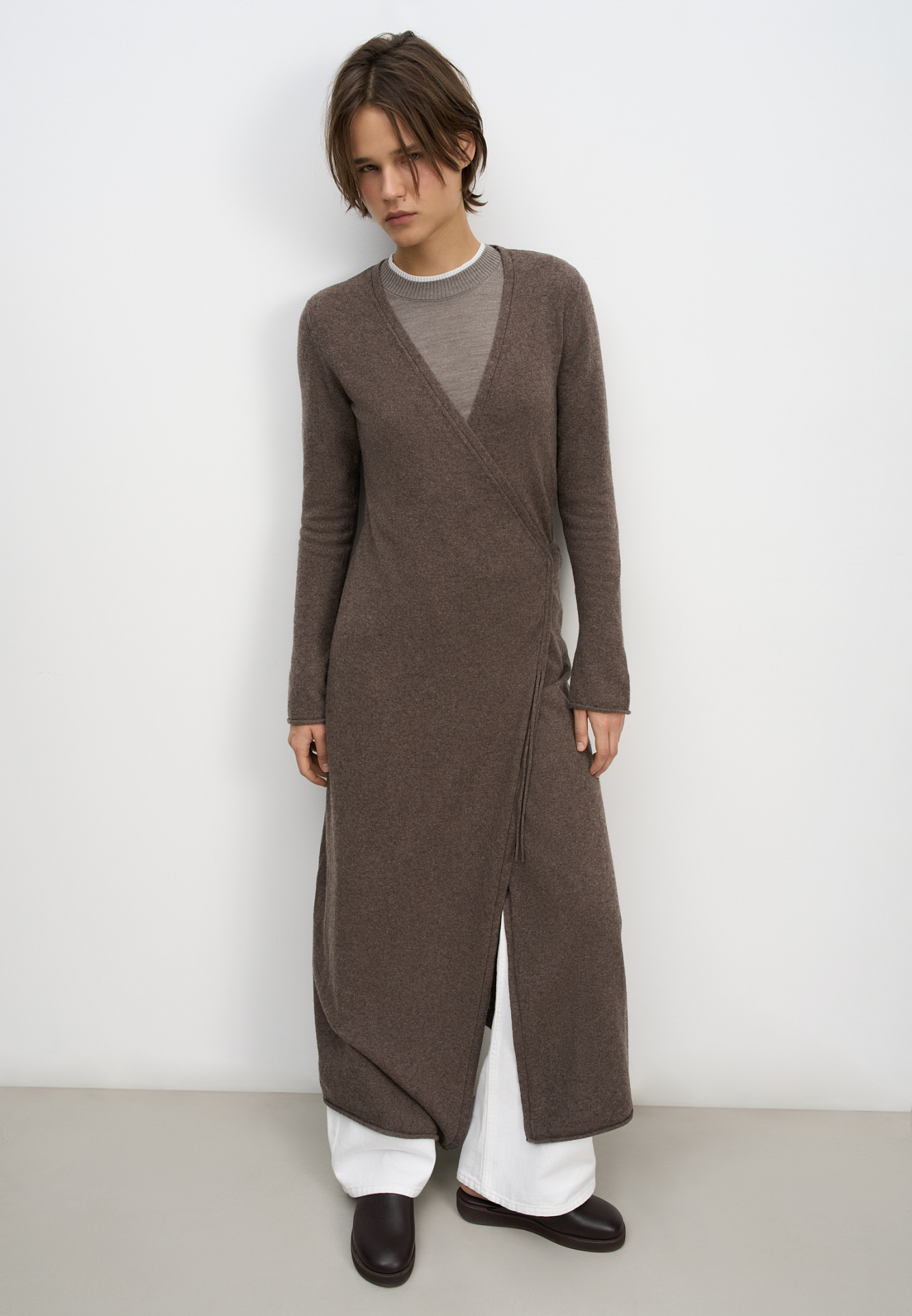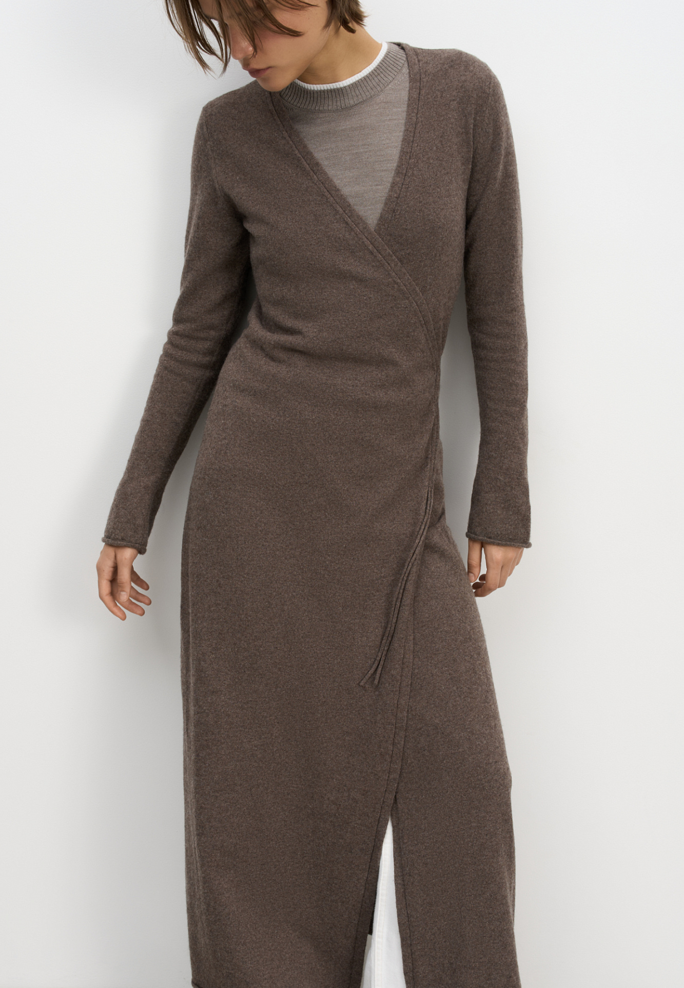 Трикотажное платье на запах из шерсти и кашемира. Модель приталенного силуэта с V-образным вырезом, длинными рукавами и кулиской на талии. Подол платья и манжеты рукавов декорированы валиками.