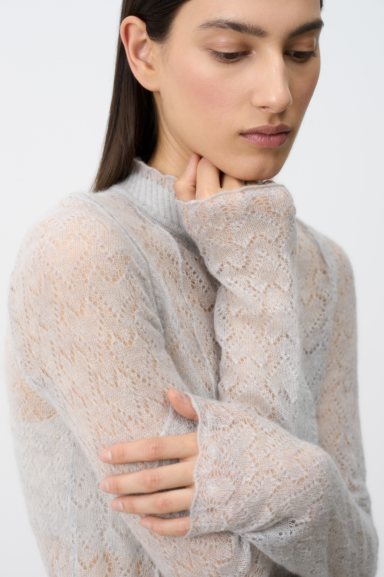Трикотажное платье длины миди из полупрозрачного кружева с подъюбником из смесовой шерсти. Модель с длинными рукавами, невысоким воротником со сборкой и эластичным поясом. Застежка на пуговицу сзади. Платье выполнено из мягкой пряжи кид мохера и беби альпака, что позволит чувствовать себя в нем комфортно и тепло.