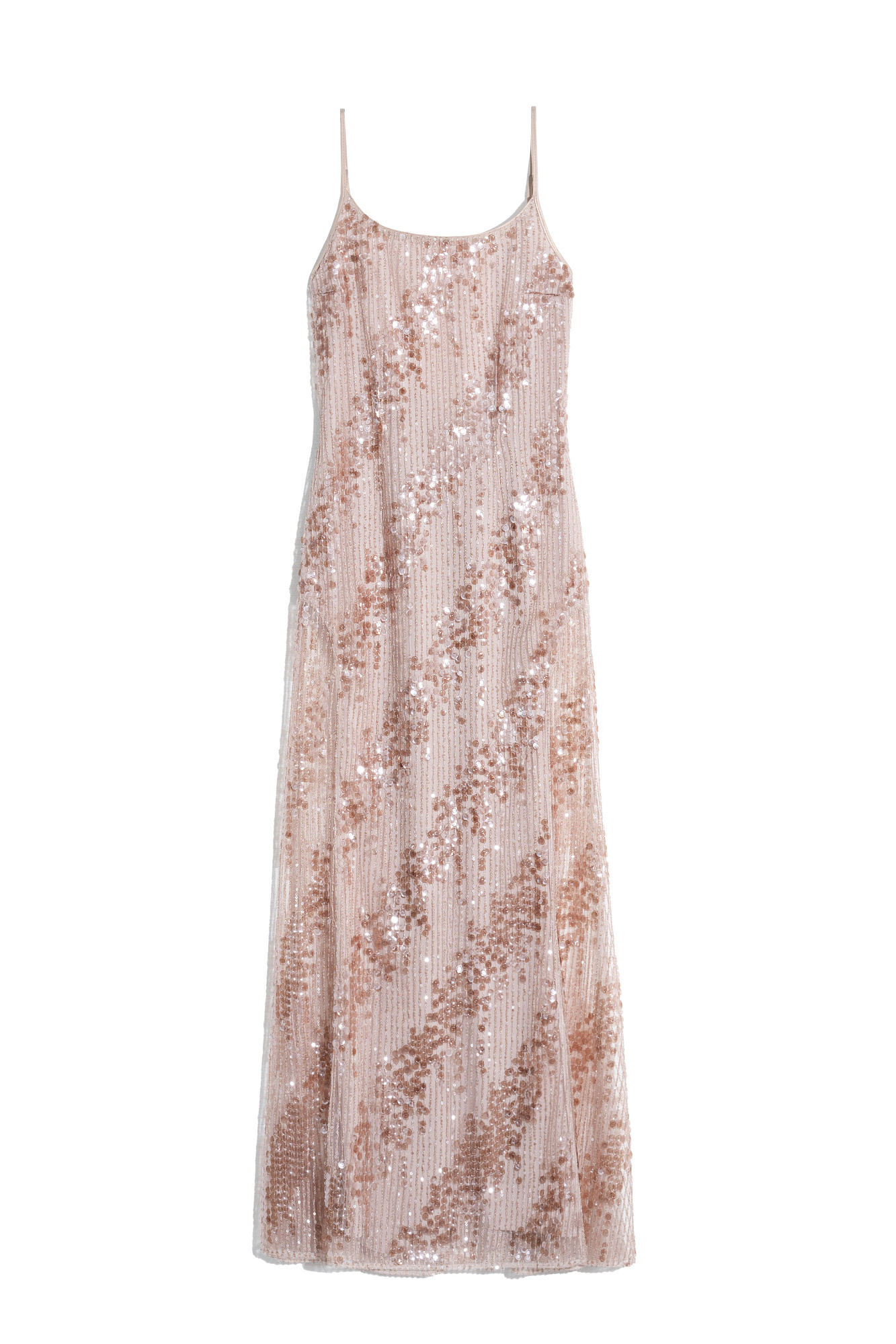 Платье с пайетками на тонких бретелях. Модель приталенного силуэта длины миди с вырезом на спине и застежкой на молнию.