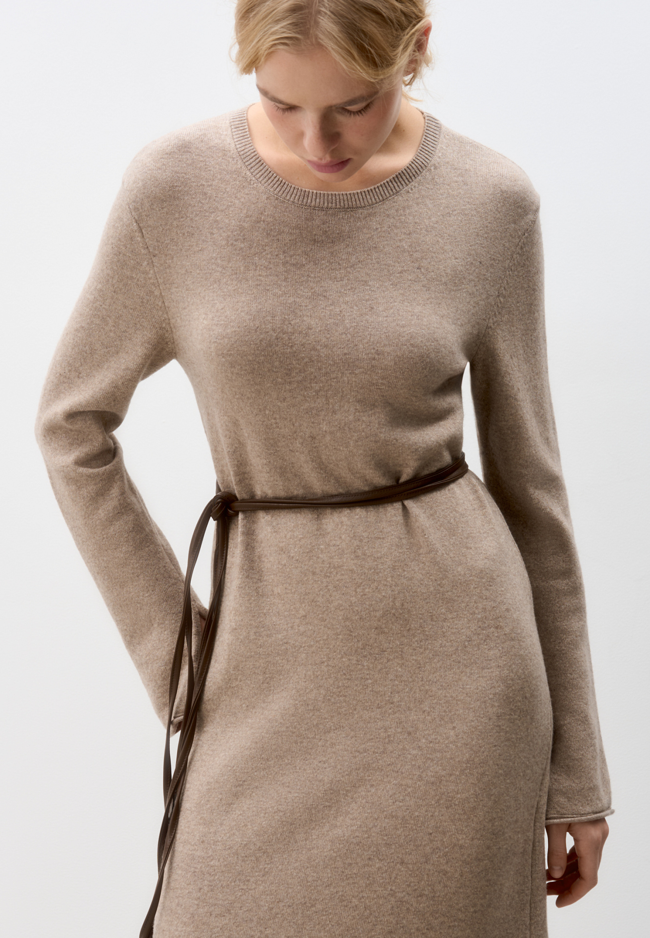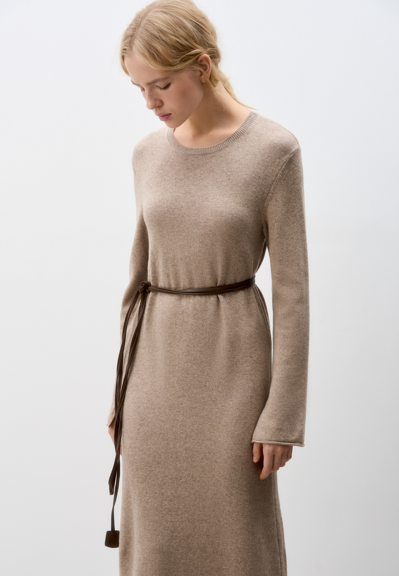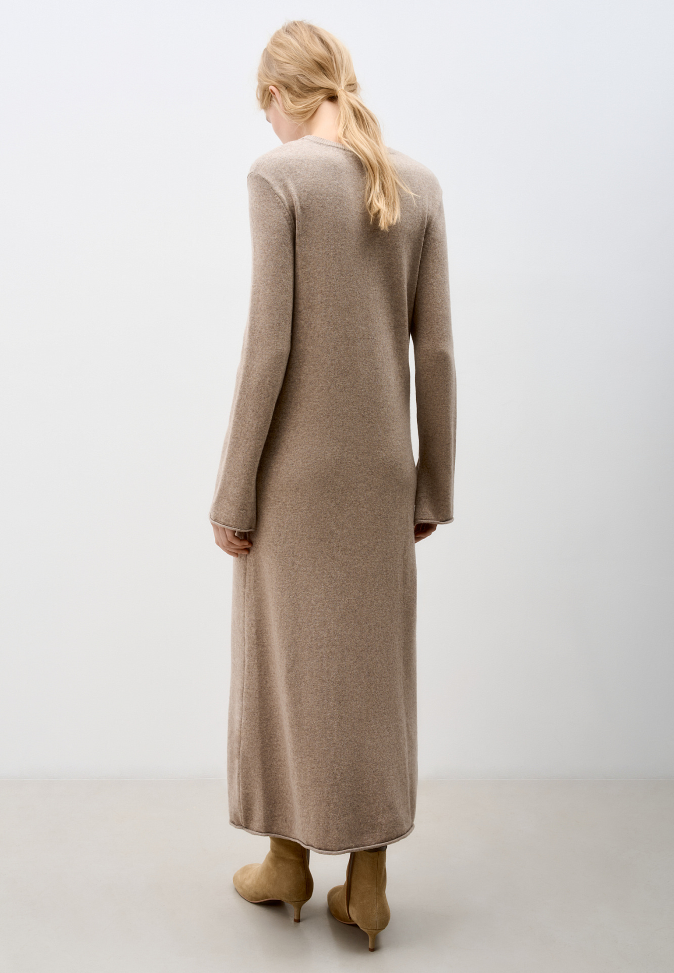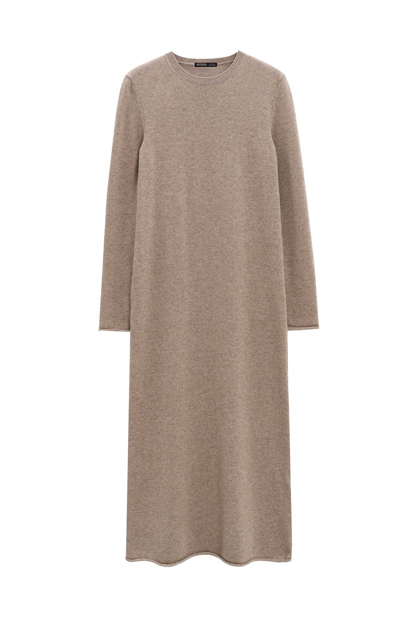 Трикотажное платье длины макси из шерсти с добавлением кашемира. Модель свободного силуэта с длинными рукавами, круглым вырезом горловины и валиком по низу изделия.