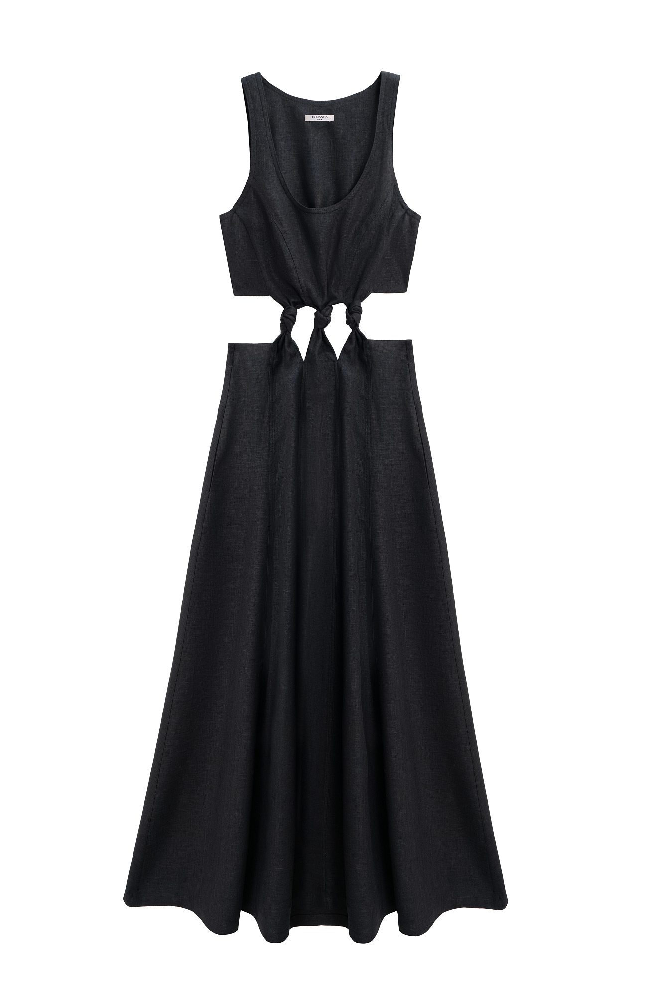 Платье длины миди из 100% льна. Модель приталенного силуэта с расклешенной юбкой, без рукавов, на широких бретельках и U-вырезом горловины. Изделие декорировано вертикальными швами и объемными узлами на талии.