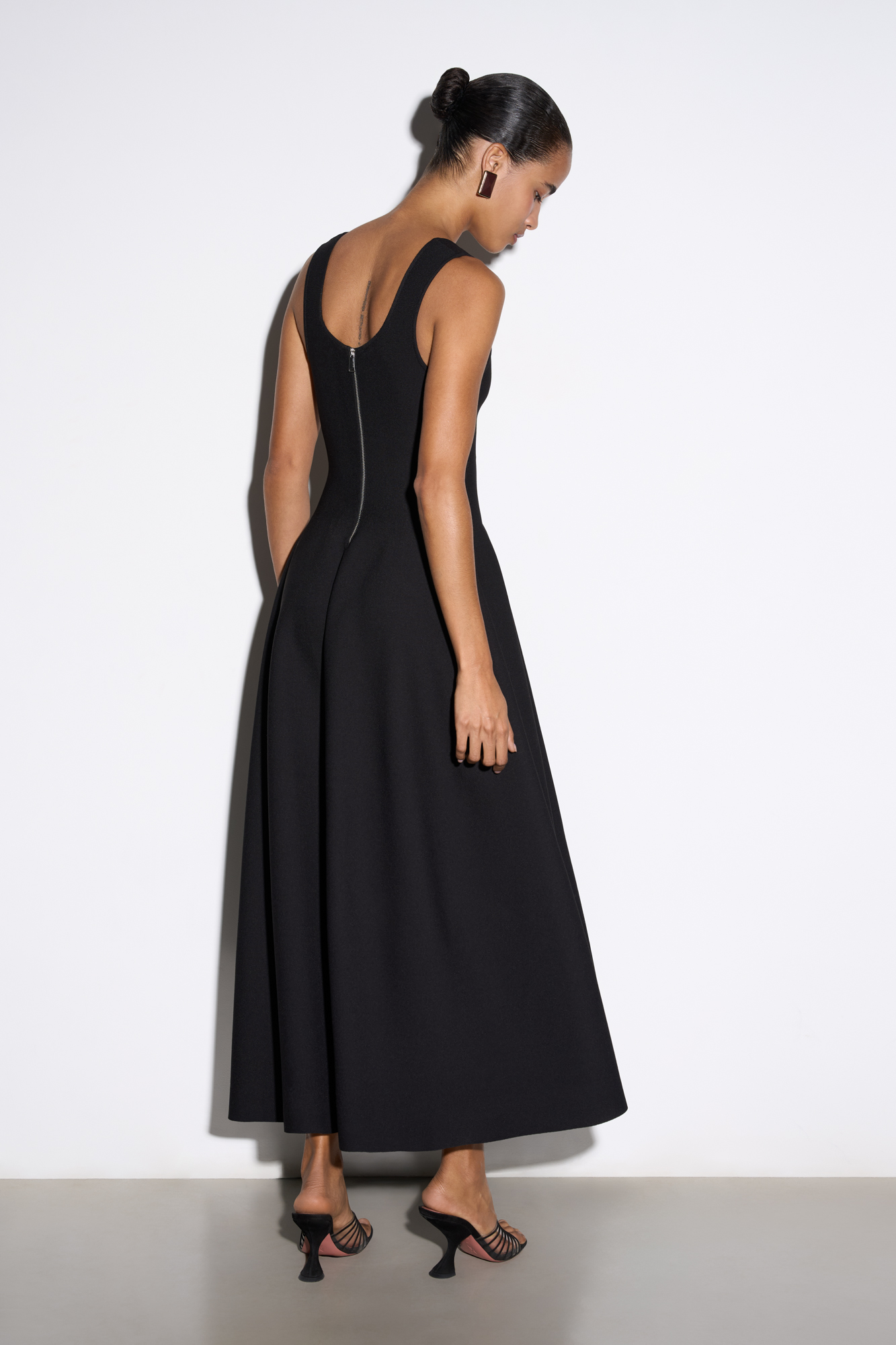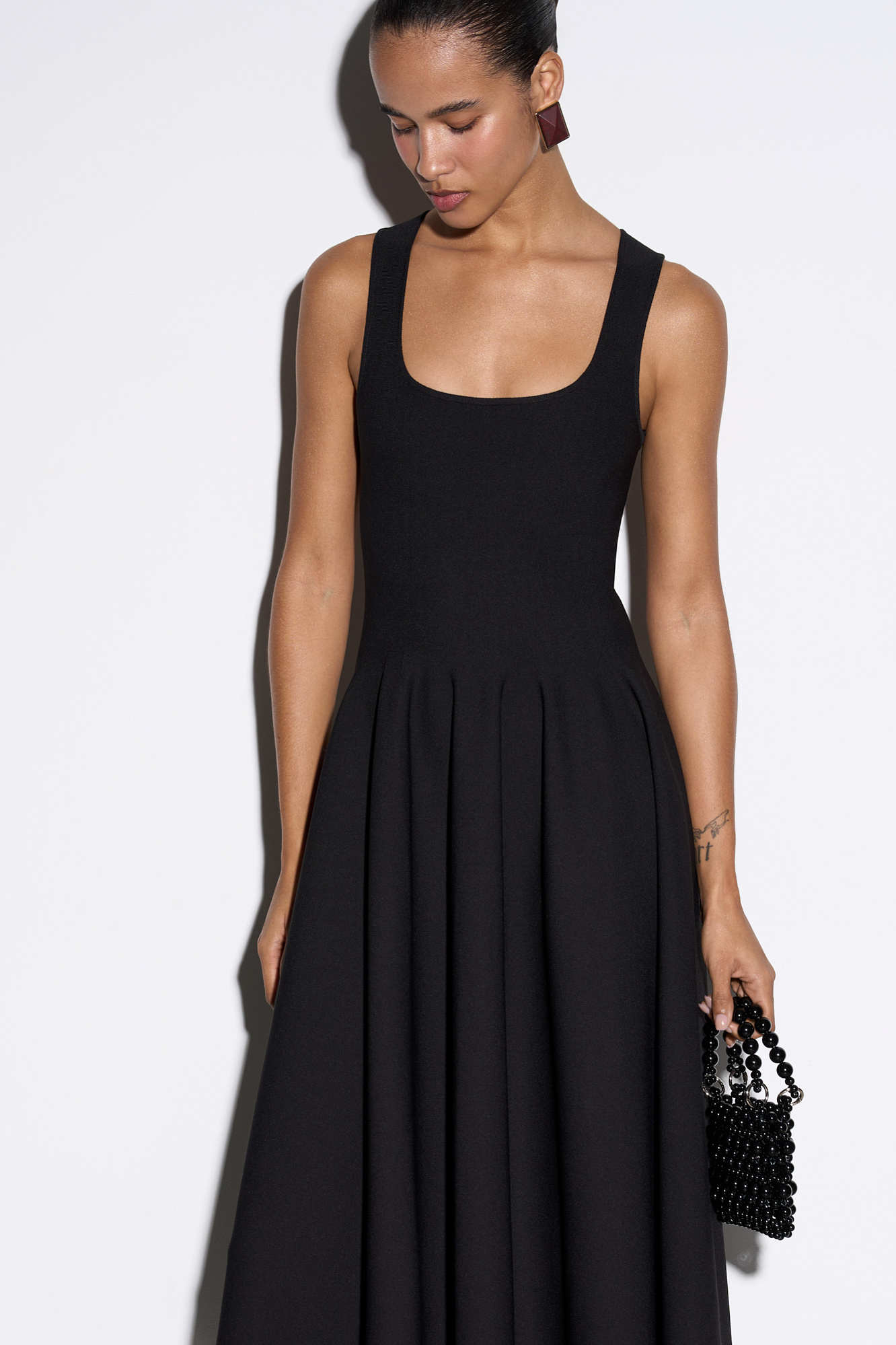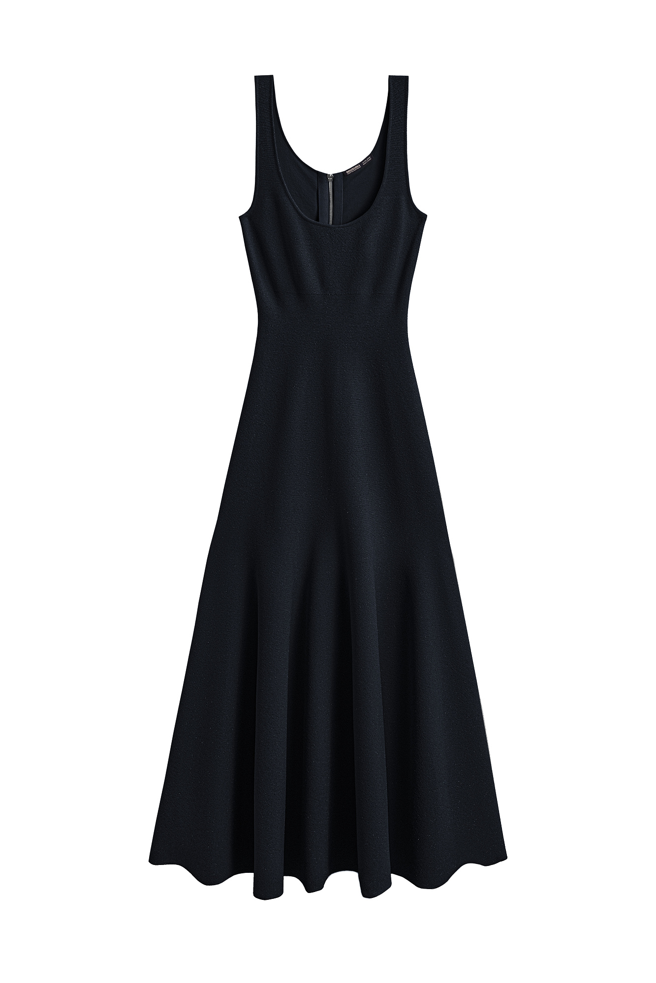 Трикотажное платье длины миди из вискозы. Модель приталенного силуэта с расклешенной юбкой с мягкими складками, без рукавов, на широких бретелях и квадратным вырезом.