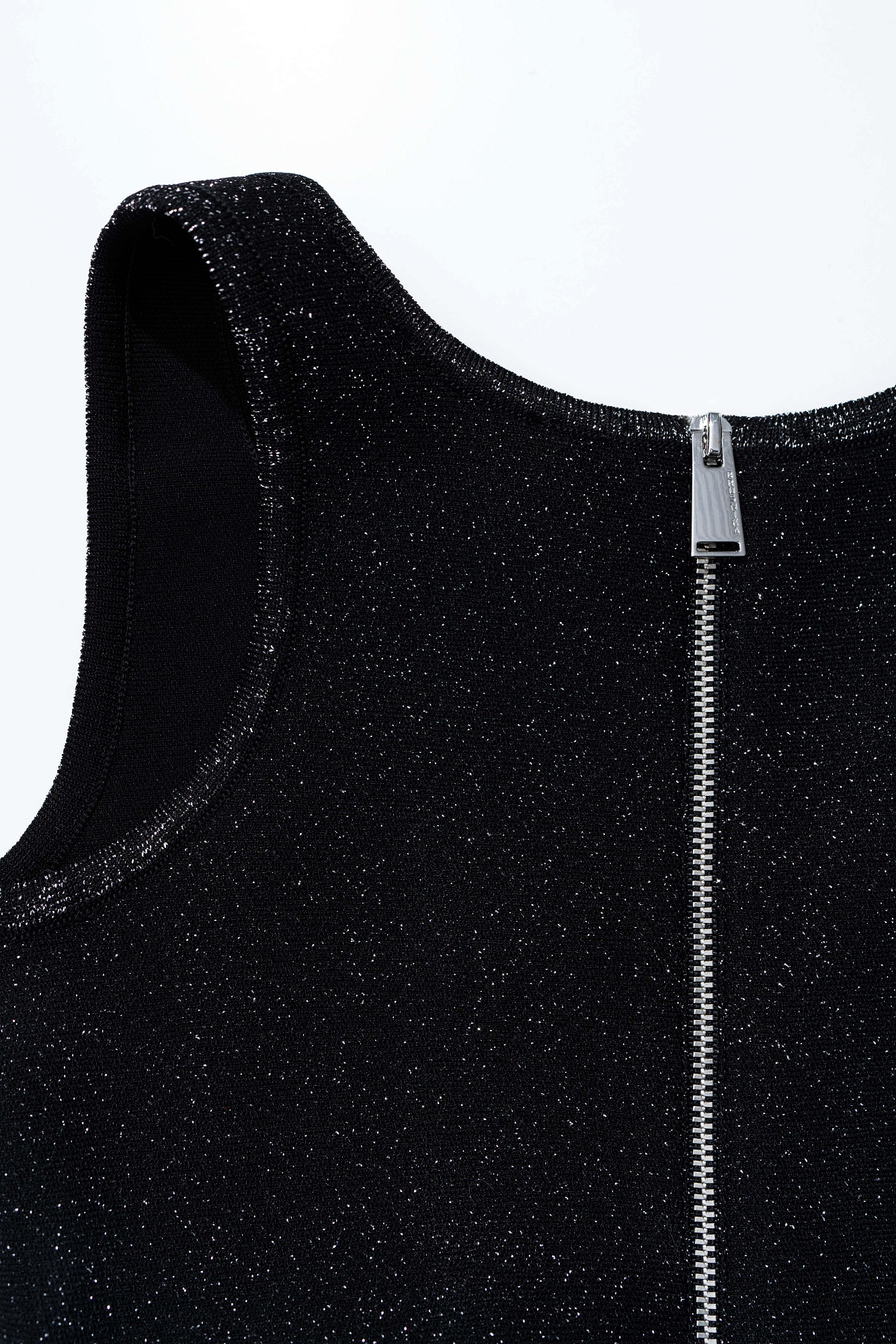 Трикотажное платье длины миди из вискозы с добавлением люрекса. Модель приталенного силуэта с расклешенной юбкой с мягкими складками, без рукавов, на широких бретелях. Застежка на молнию сзади.