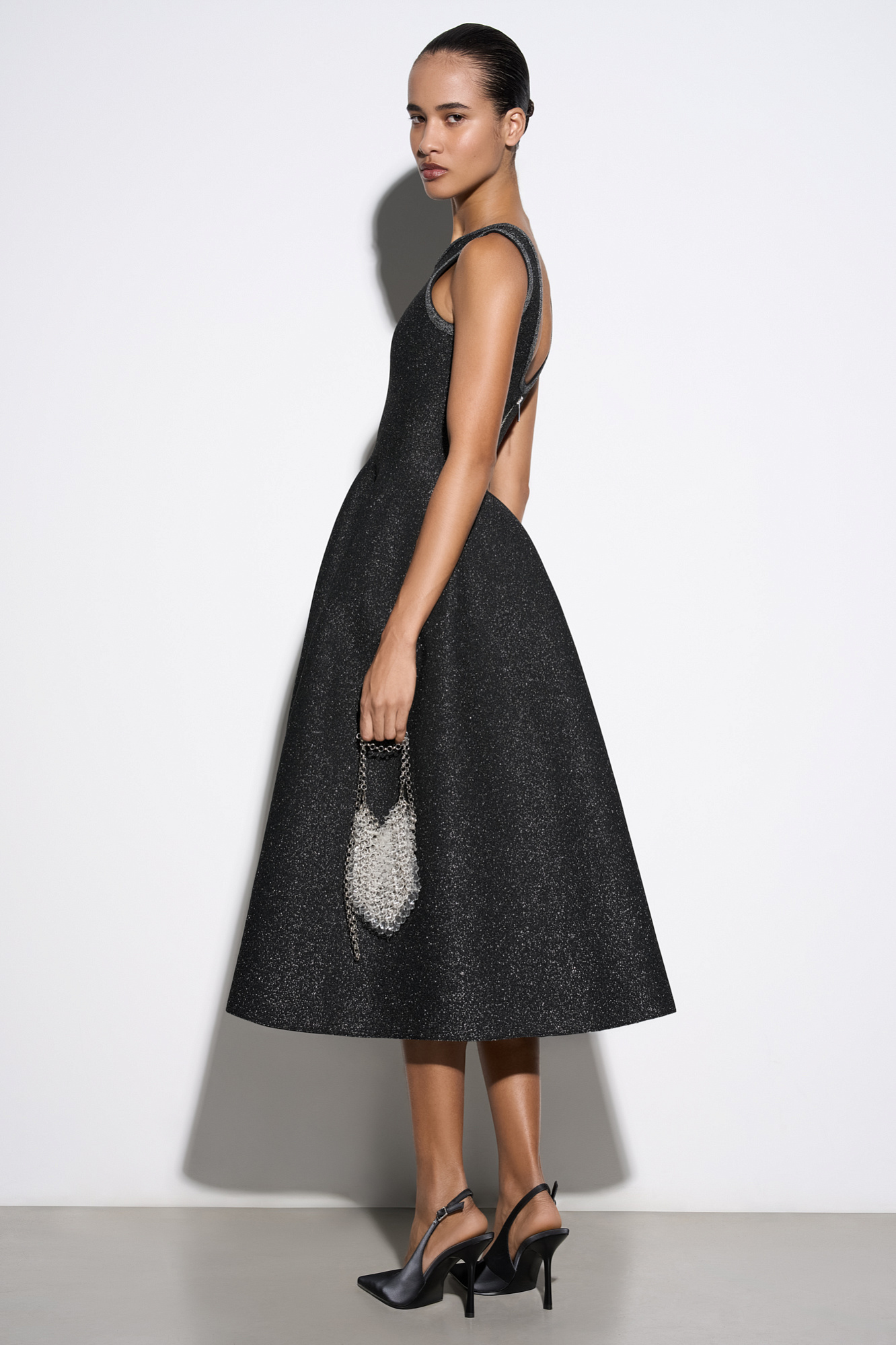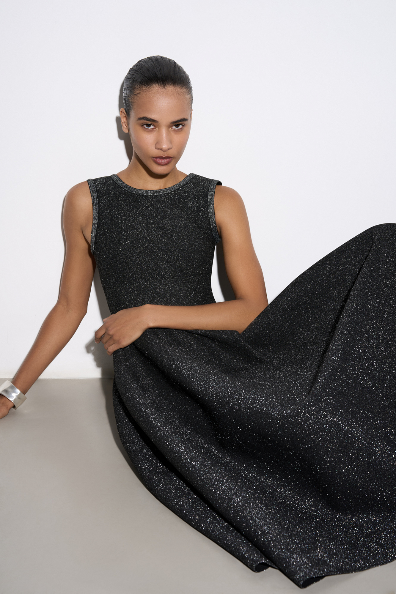 Трикотажное платье длины миди с люрексом. Модель по фигуре с юбкой, расклешенной от талии, без рукавов, на широких бретельках.