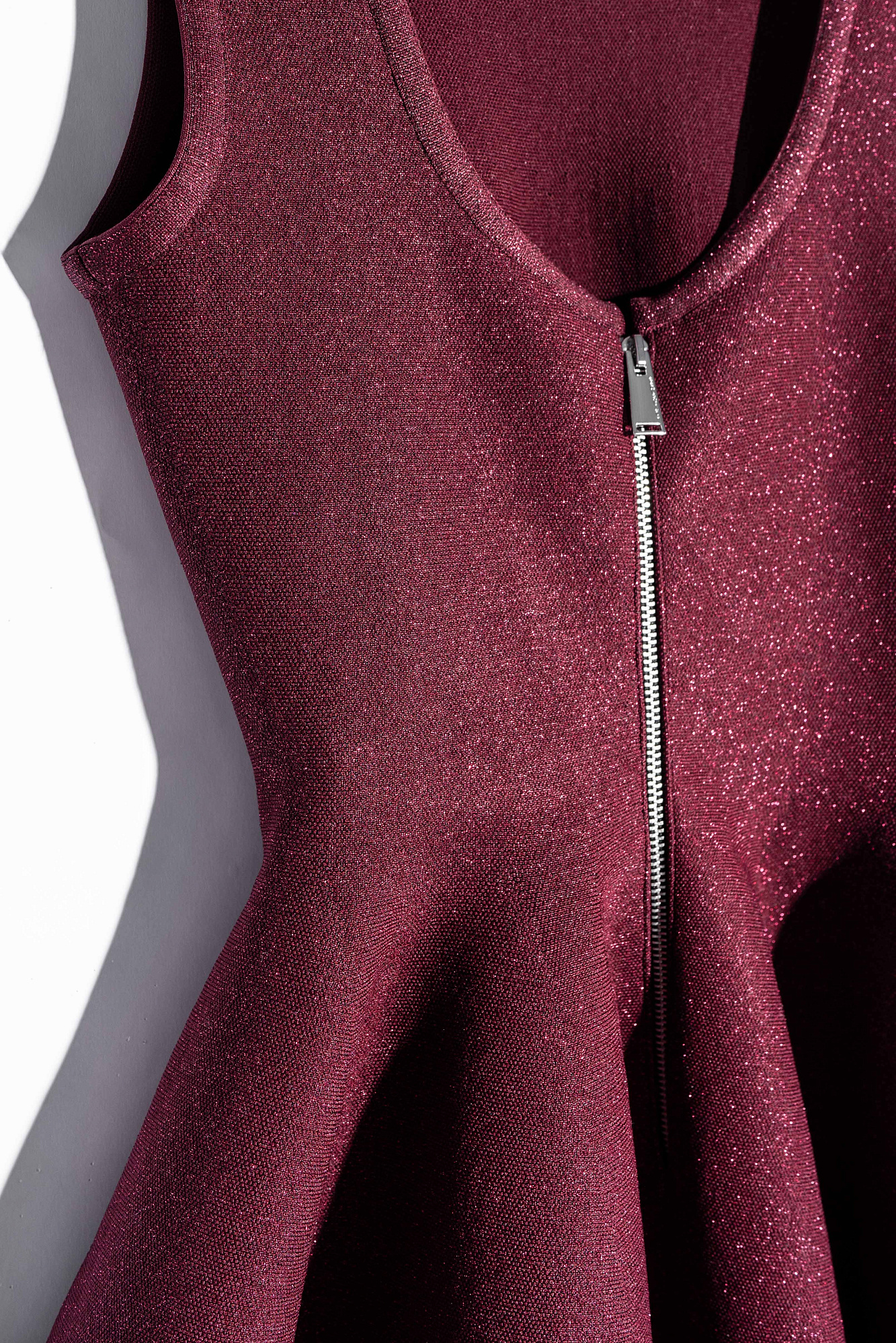 Трикотажное платье длины миди с люрексом. Модель по фигуре с юбкой, расклешенной от талии, без рукавов, на широких бретельках.