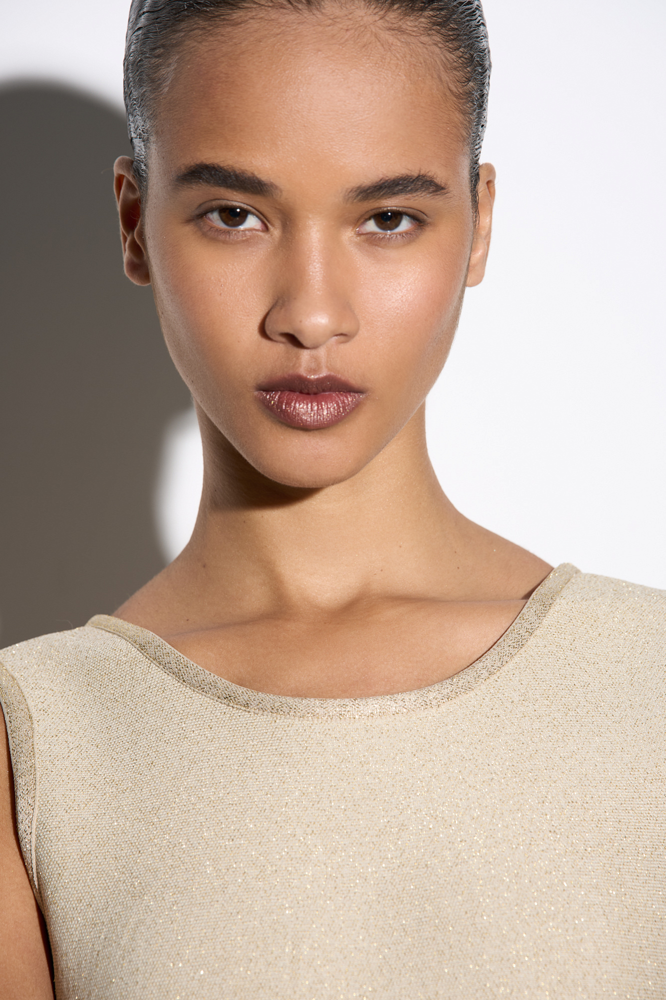 Трикотажное платье длины миди с люрексом. Модель по фигуре с юбкой, расклешенной от талии, без рукавов, на широких бретельках.