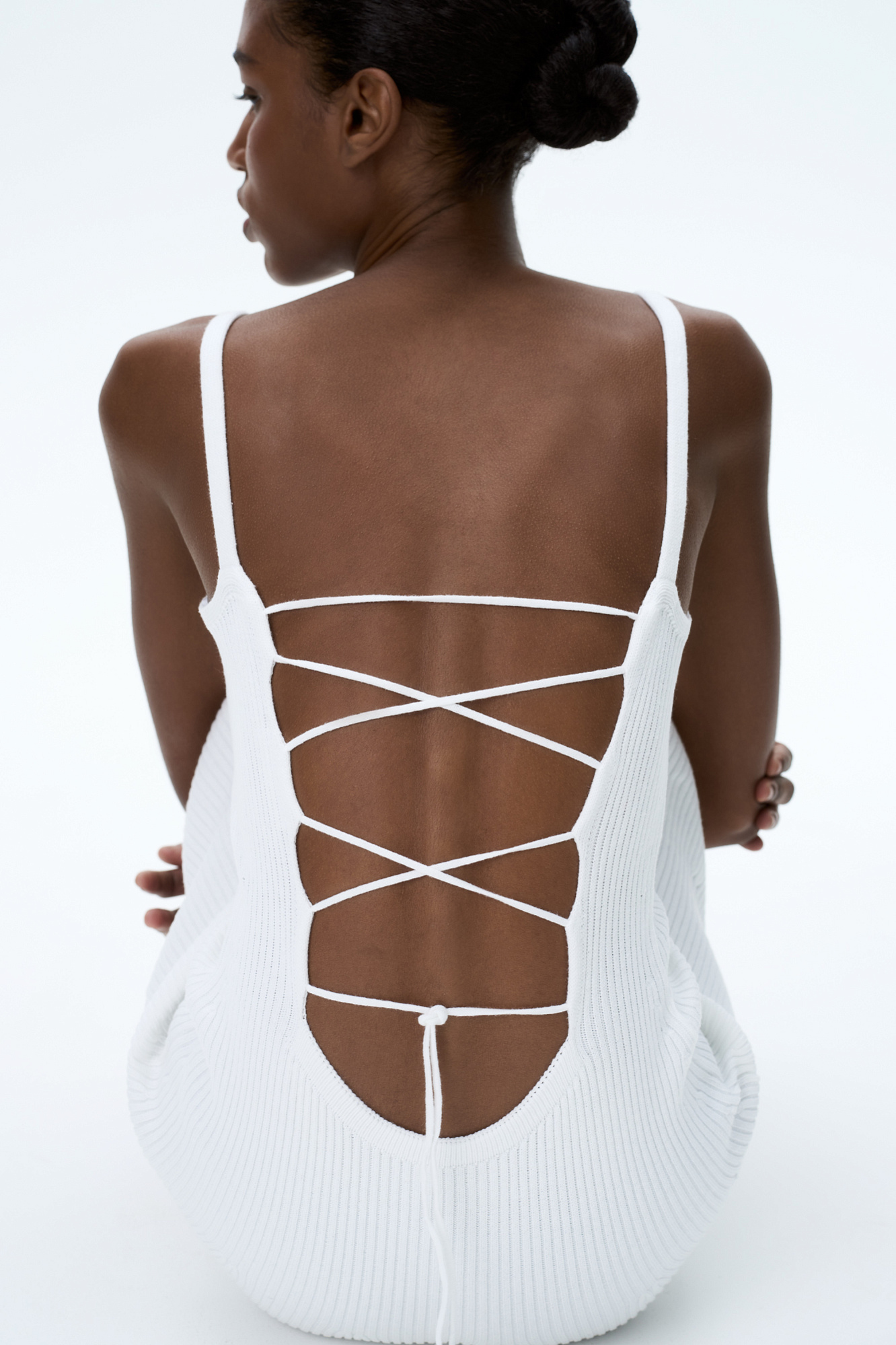 Трикотажный сарафан из 100% хлопка. Модель приталенного силуэта с разрезом сбоку и шнуровкой на спине.