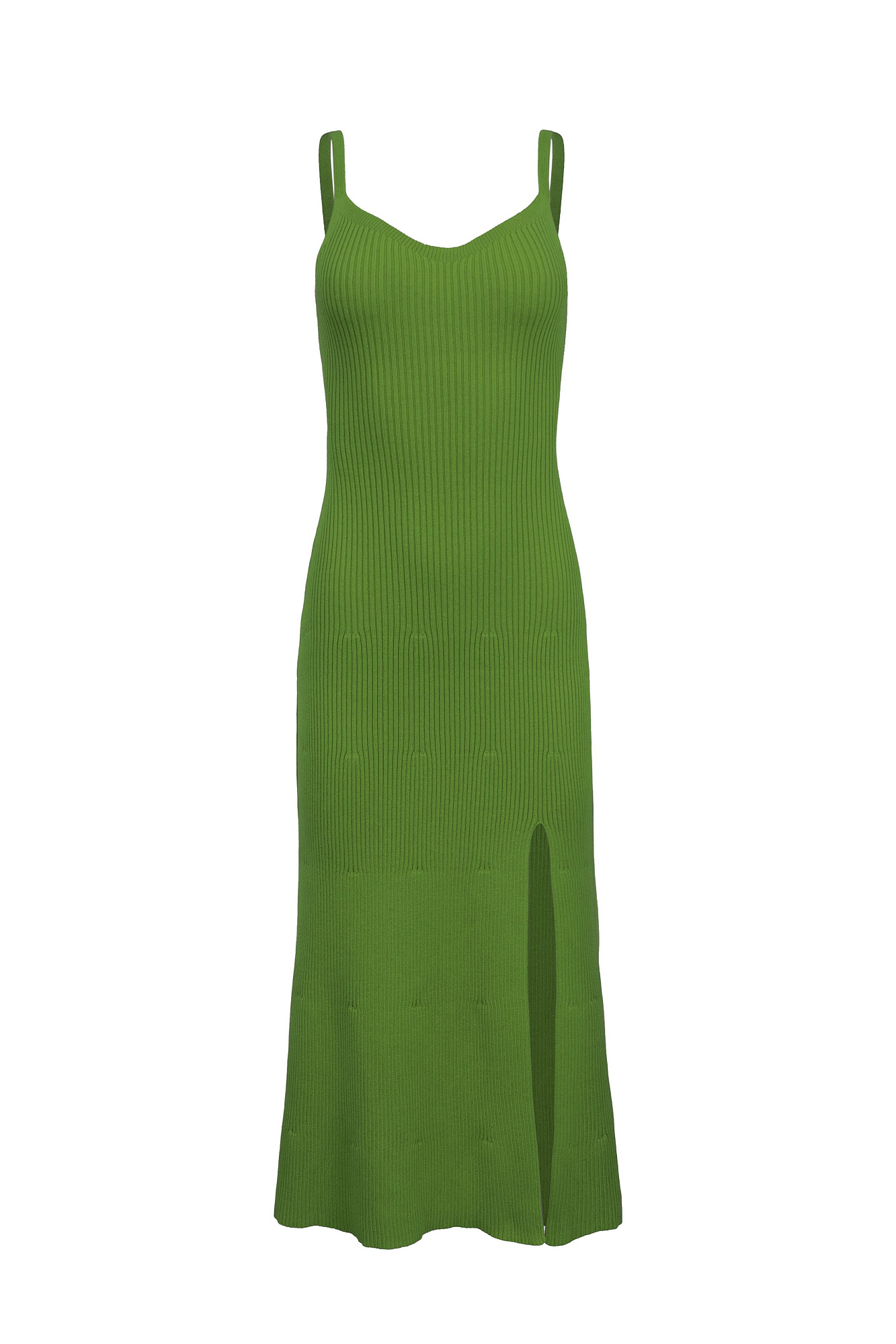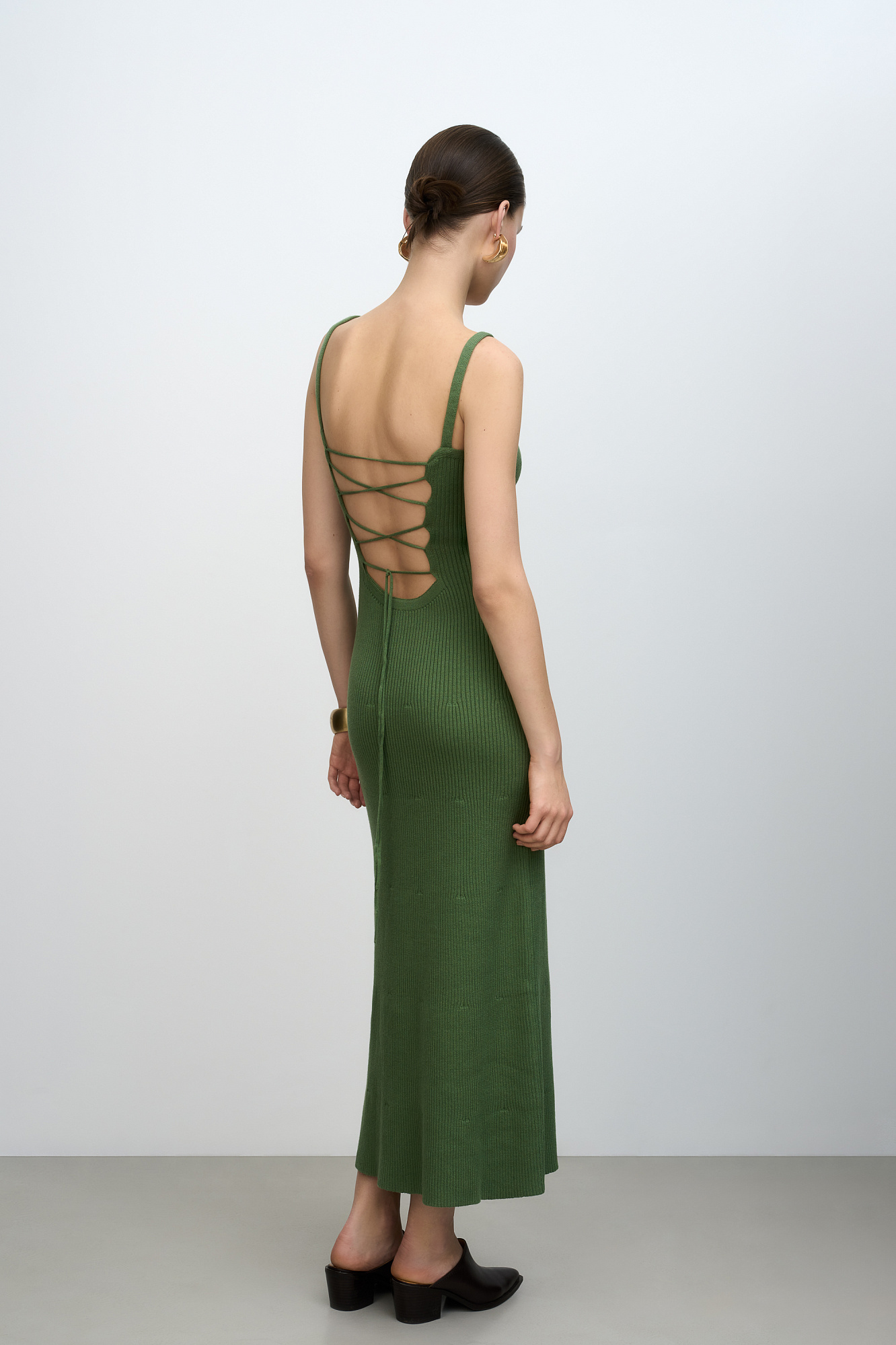 Трикотажный сарафан из 100% хлопка. Модель приталенного силуэта с разрезом сбоку и шнуровкой на спине.