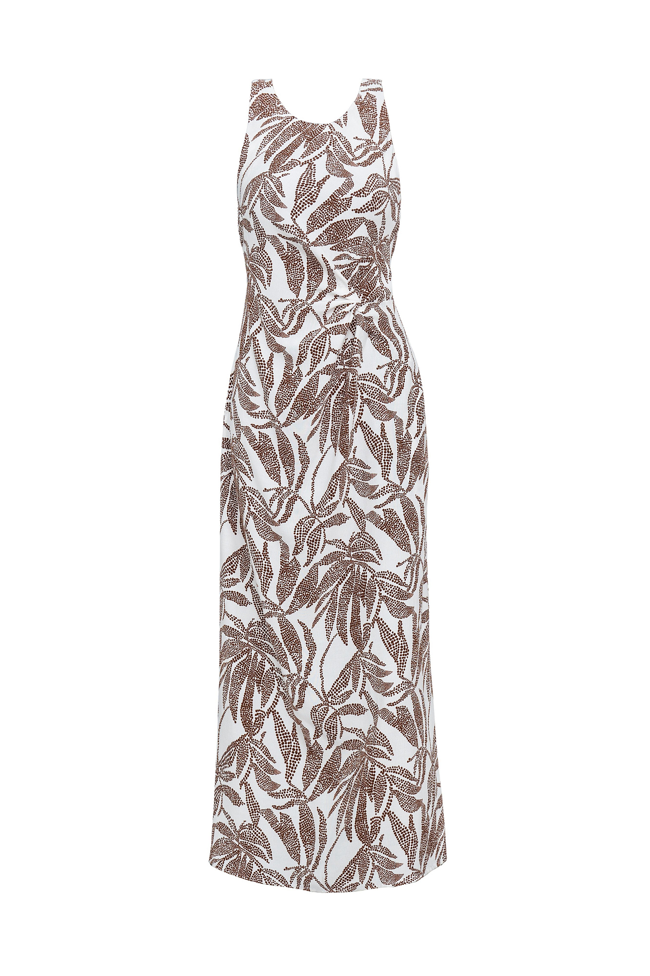 Принтованный сарафан с перекрутом на талии. Приталенная по крою модель в длине макси с круглым вырезом, открытой спиной и широкими перекрестными бретелями.
