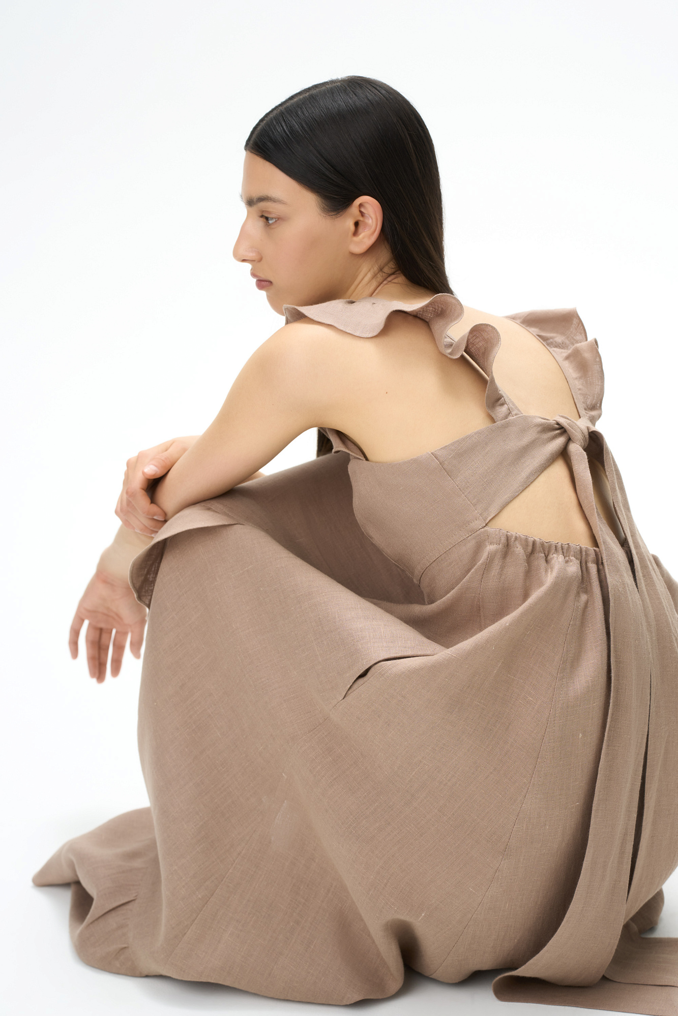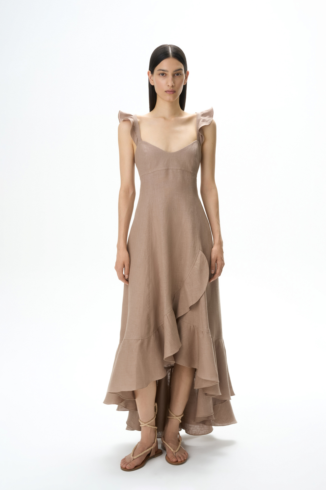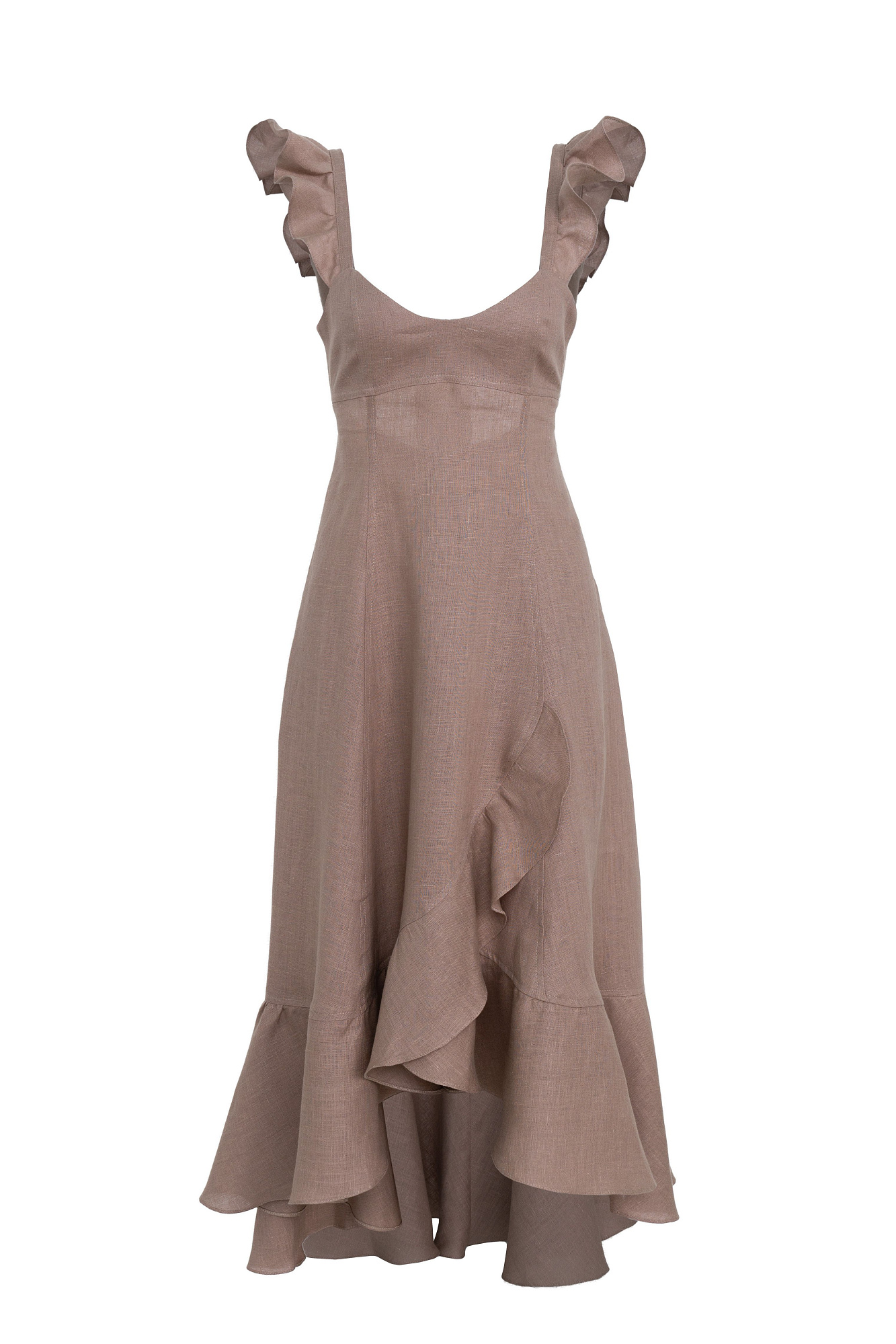Сарафан длины миди из 100% льна. Модель без рукавов на широкиз лямках с оборками, открытой спиной, асимметричным низом и воланами на юбке.