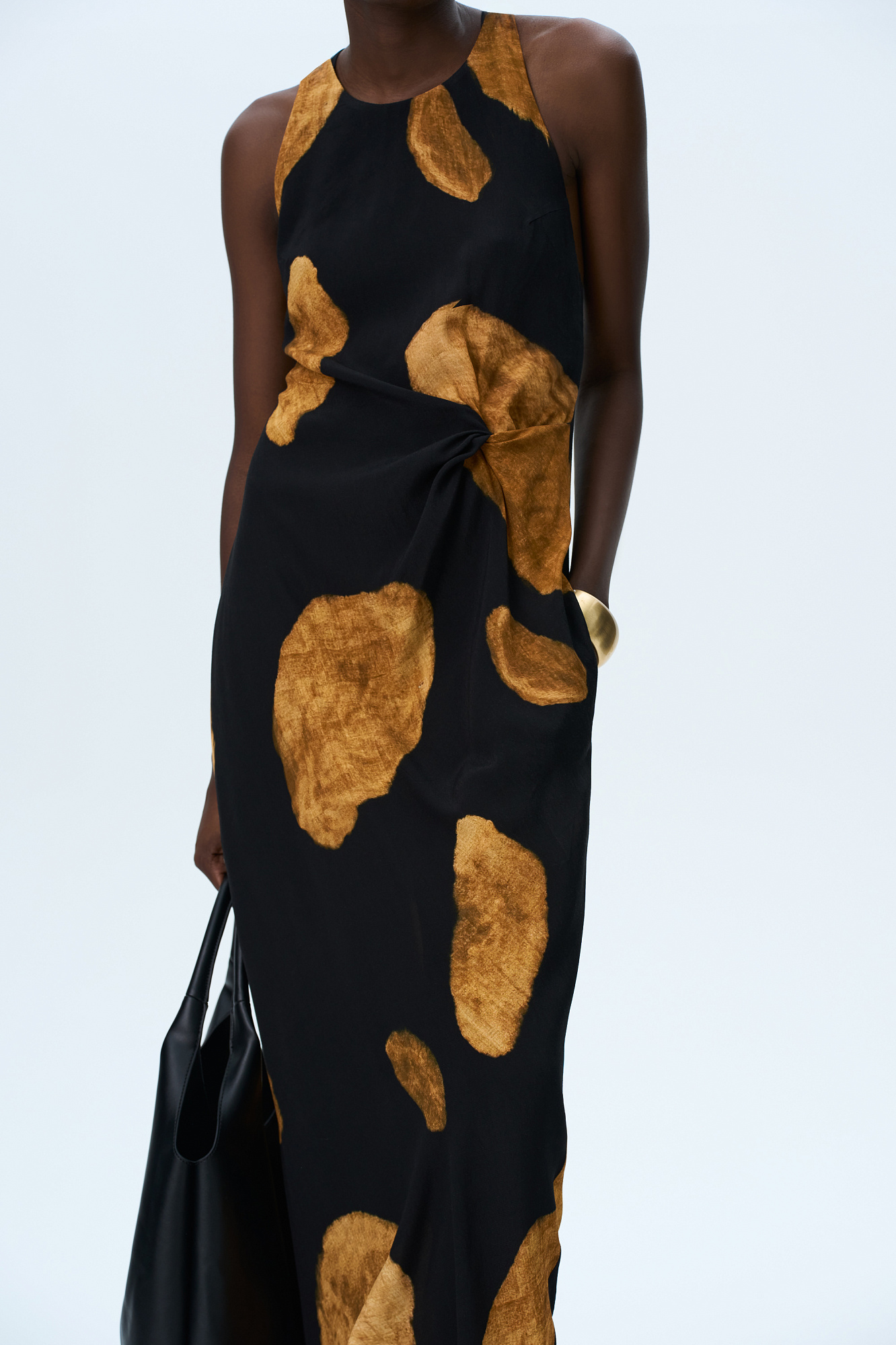 Принтованный сарафан длины миди из 100% вискозы. Модель прямого кроя, с круглым вырезом горловины, без рукавов, на широких бретелях, перекрученных на спине, драпировкой на талии и двумя боковыми карманами.
