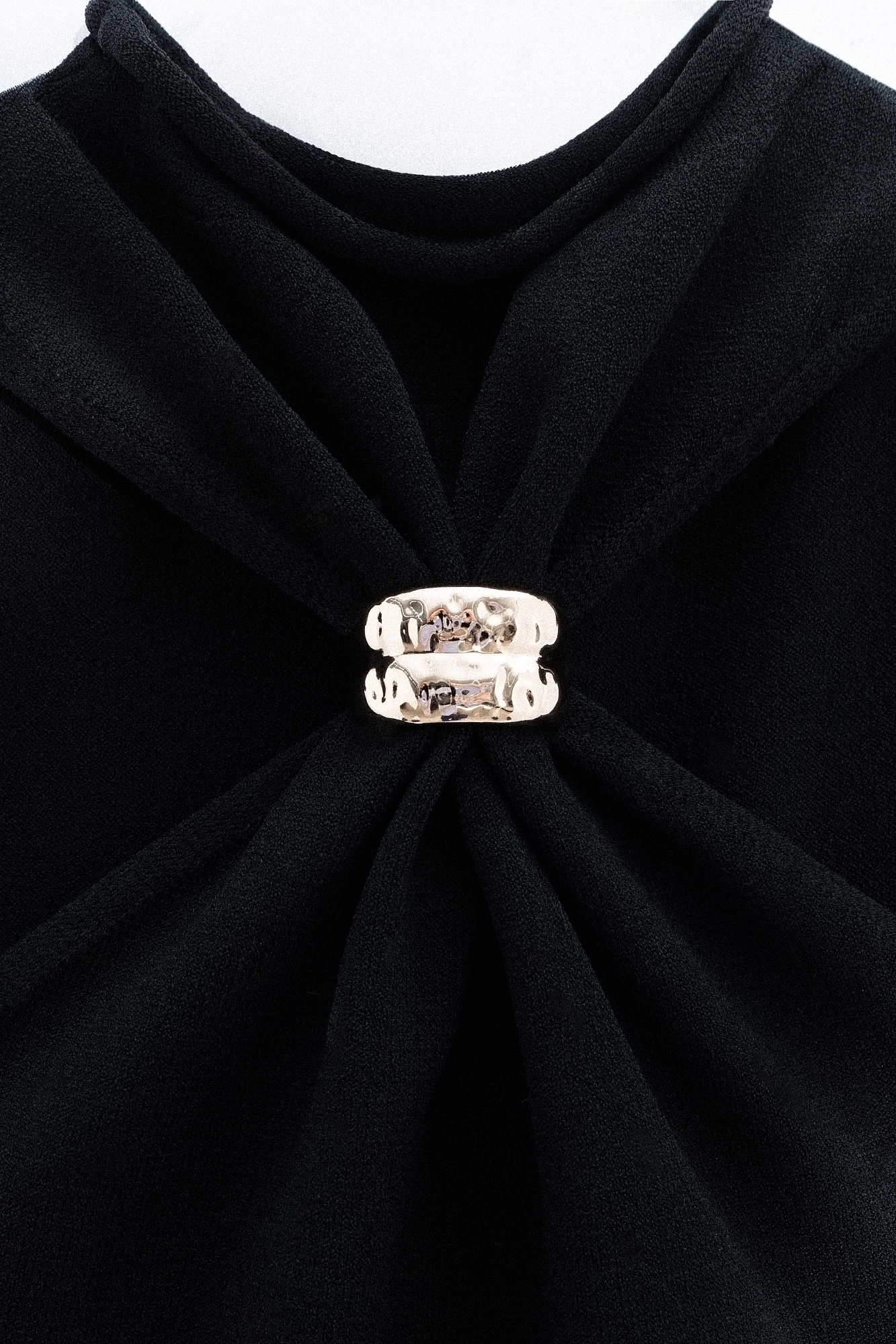 Вечернее платье длины мини из вискозы. Модель приталенного силуэта без рукавов, с американской проймой, акцентом на шее и драпировкой на бедрах.