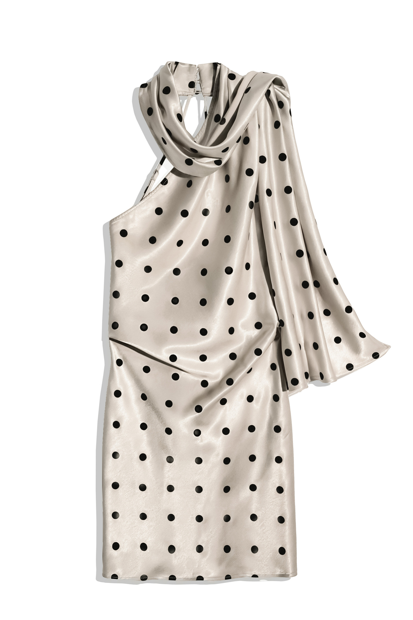 Атласное платье длины мини в горох. Модель по фигуре с вырезом халтер, застежкой на шее на пуговицы, открытой спинкой и тонкими регулируемыми бретельками. Изделие декорировано длинным шарфом.