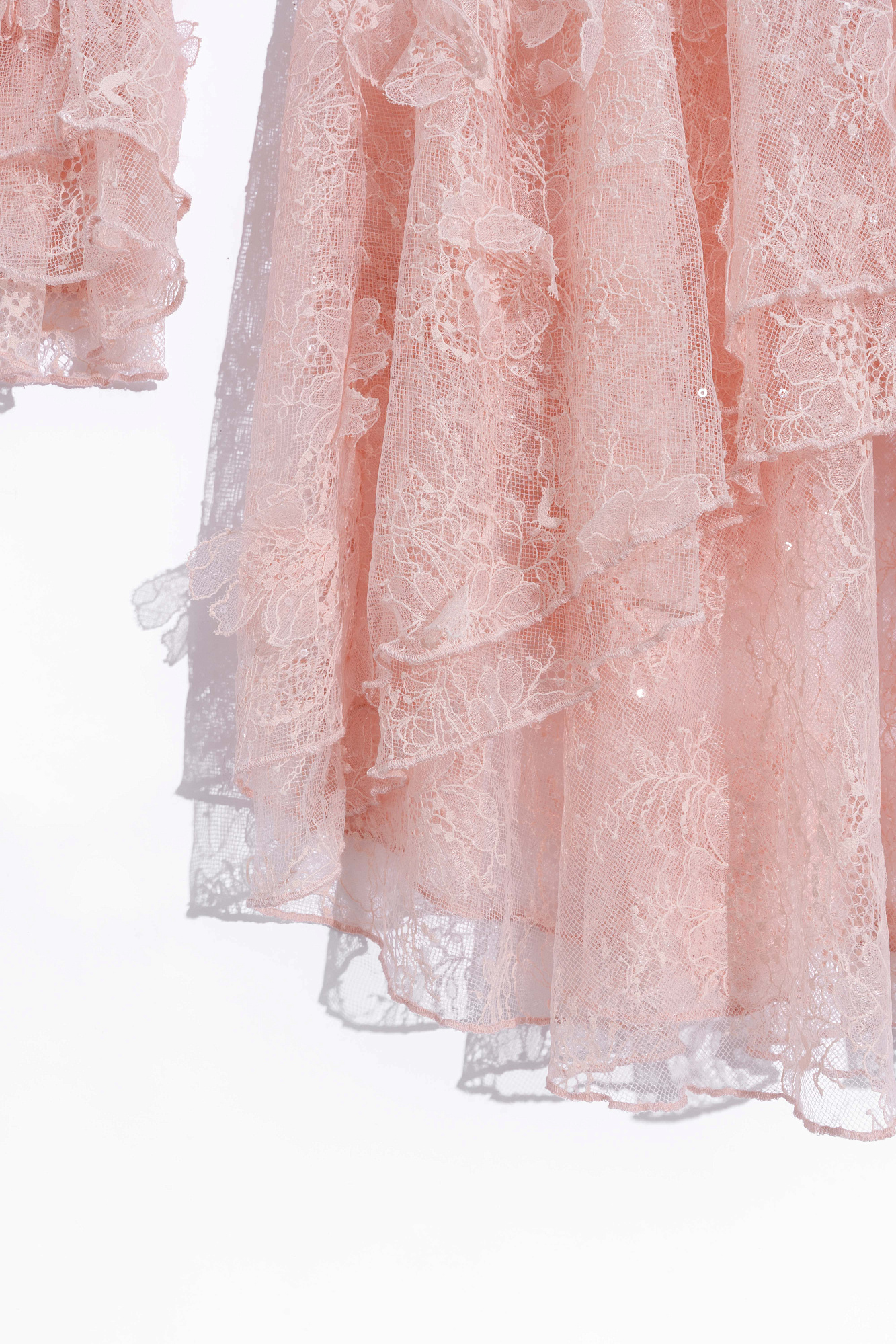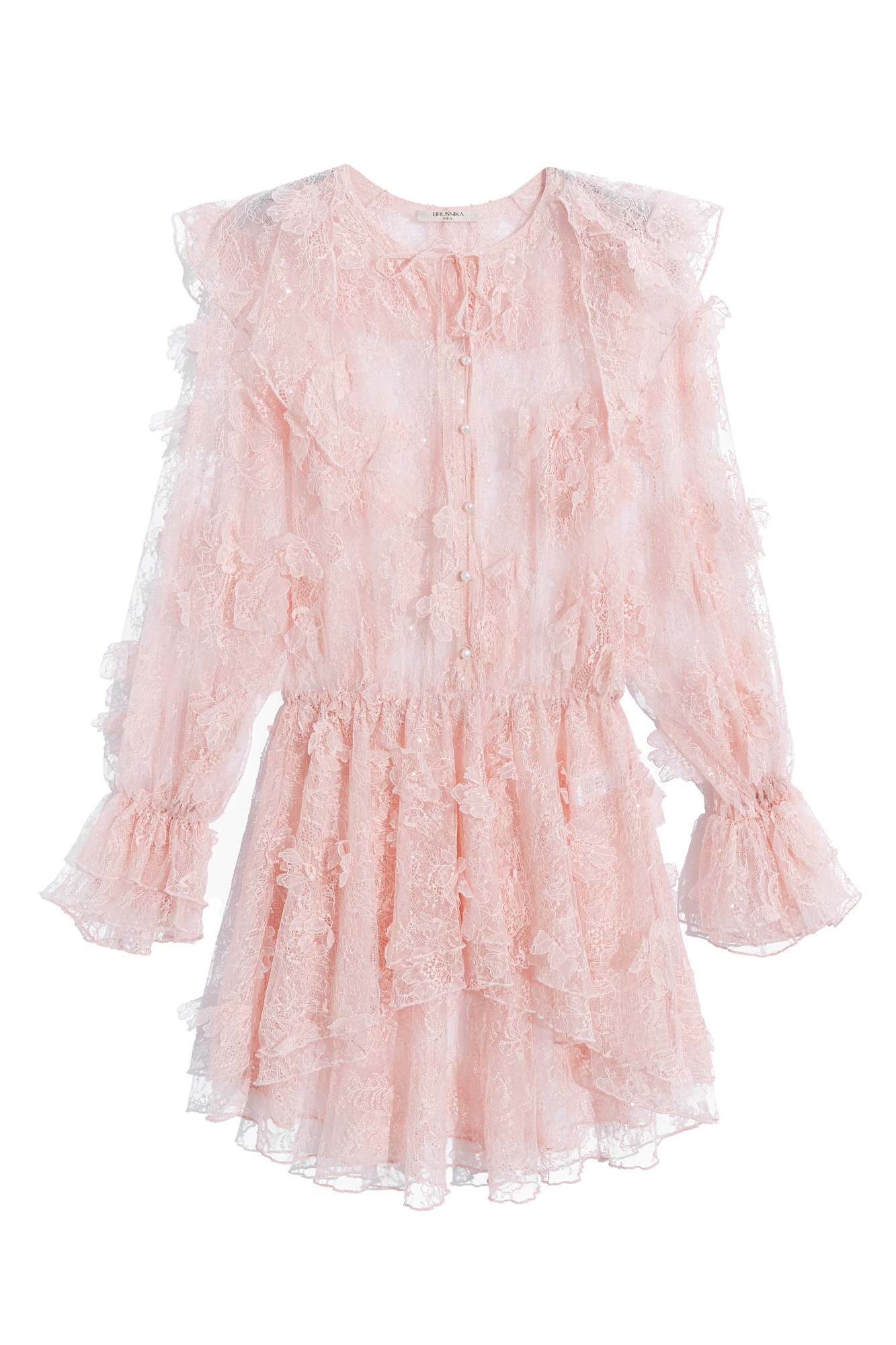 Платье длины мини из тонкого кружева с объемным декором в виде цветов. Модель свободного кроя с длинными рукавами, манжетами и круглым вырезом горловины с жабо. Застежка на пуговицы. Горловина фиксируется на шее тонким шнурком. Изделие выполнено без подкладки.