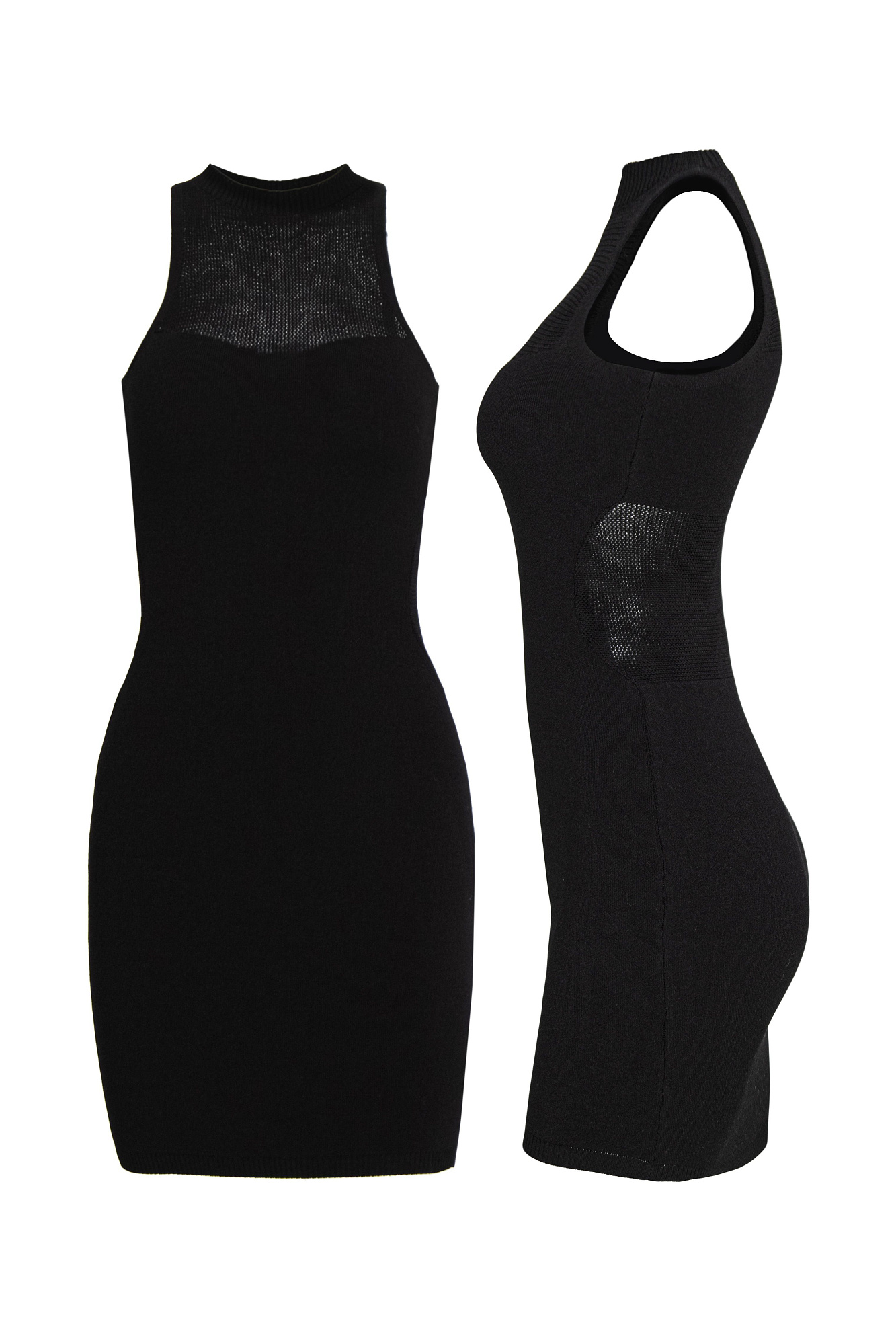 Трикотажное платье из вискозы длины мини. Модель по фигуре с неглубоким вырезом горловины, американской проймой и открытыми плечами. Изделие декорировано вставкой из сетки на груди.