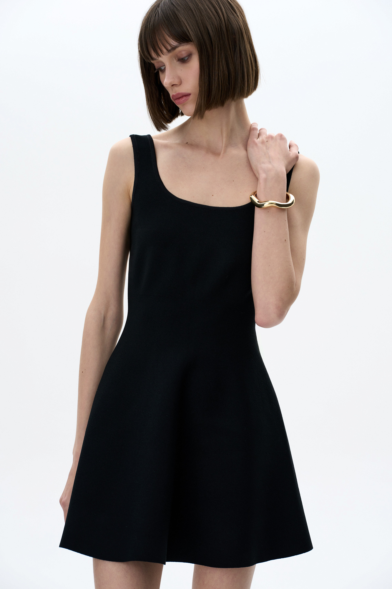 Трикотажное мини платье в стиле baby doll на широких бретелях. Круглый вырез, застежка сзади на молнию. Платье связано из плотной эластичной вискозы, что позволяет прилегать по фигуре и держать объем у юбки.