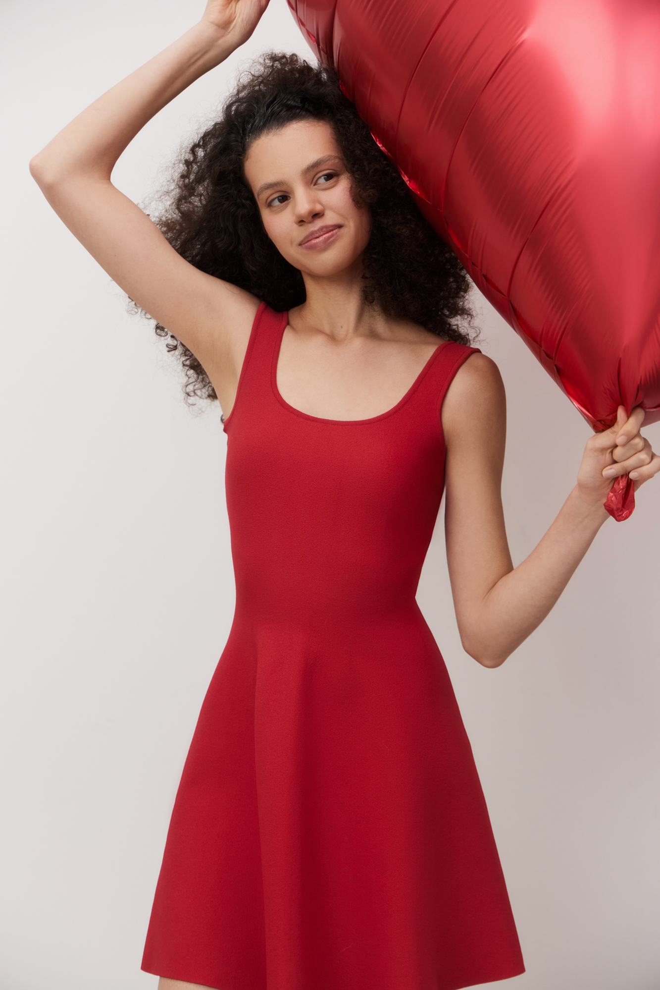 Трикотажное мини платье в стиле baby doll на широких бретелях. Круглый вырез, застежка сзади на молнию. Платье связано из плотной эластичной вискозы, что позволяет прилегать по фигуре и держать объем у юбки.