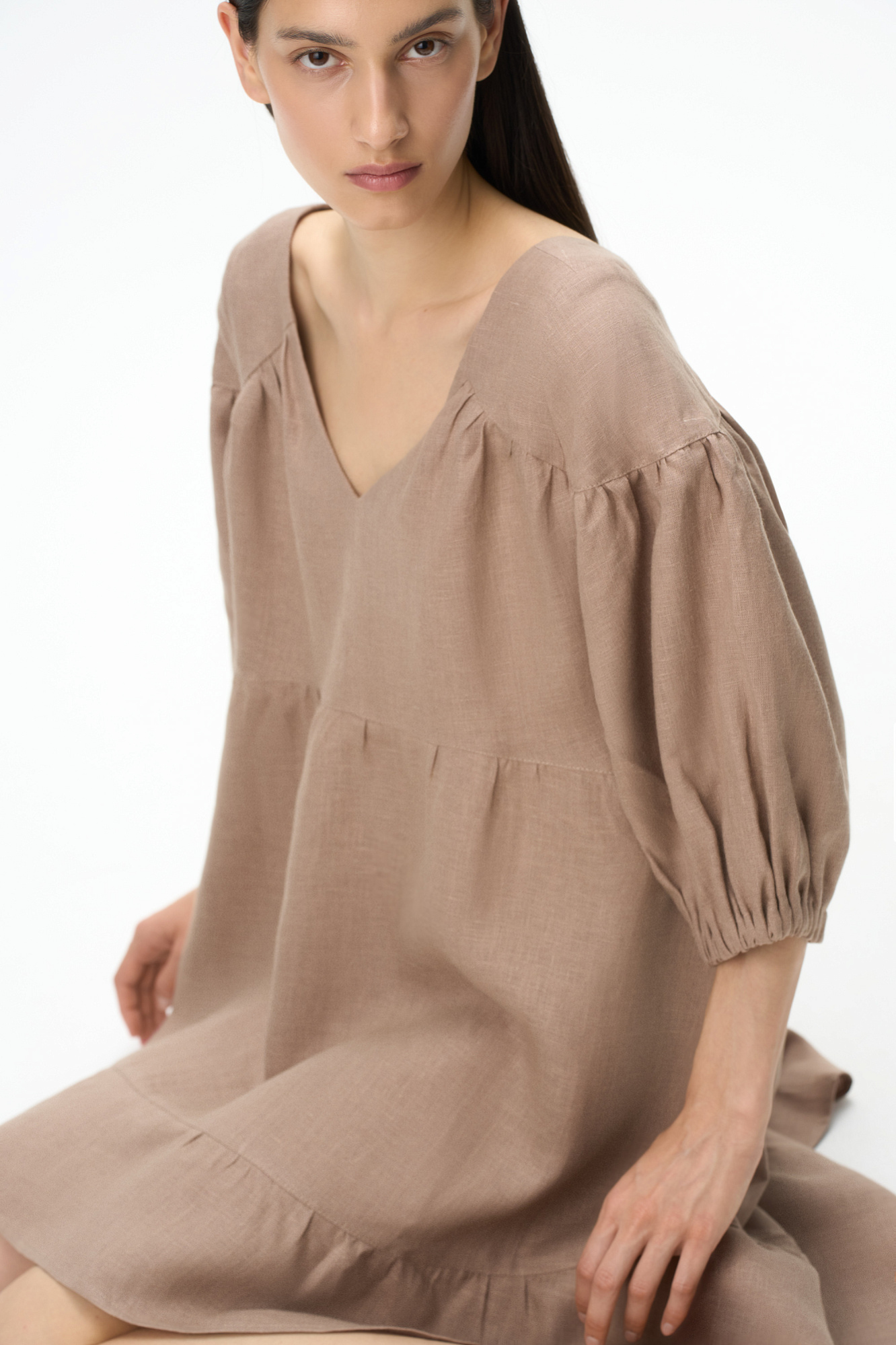 Короткое платье из 100% льна с расклешением от талии и широким асимметричным воланом внизу. Модель свободного кроя с коротким рукавом на резинке и V-образным вырезом с завязками на спине.