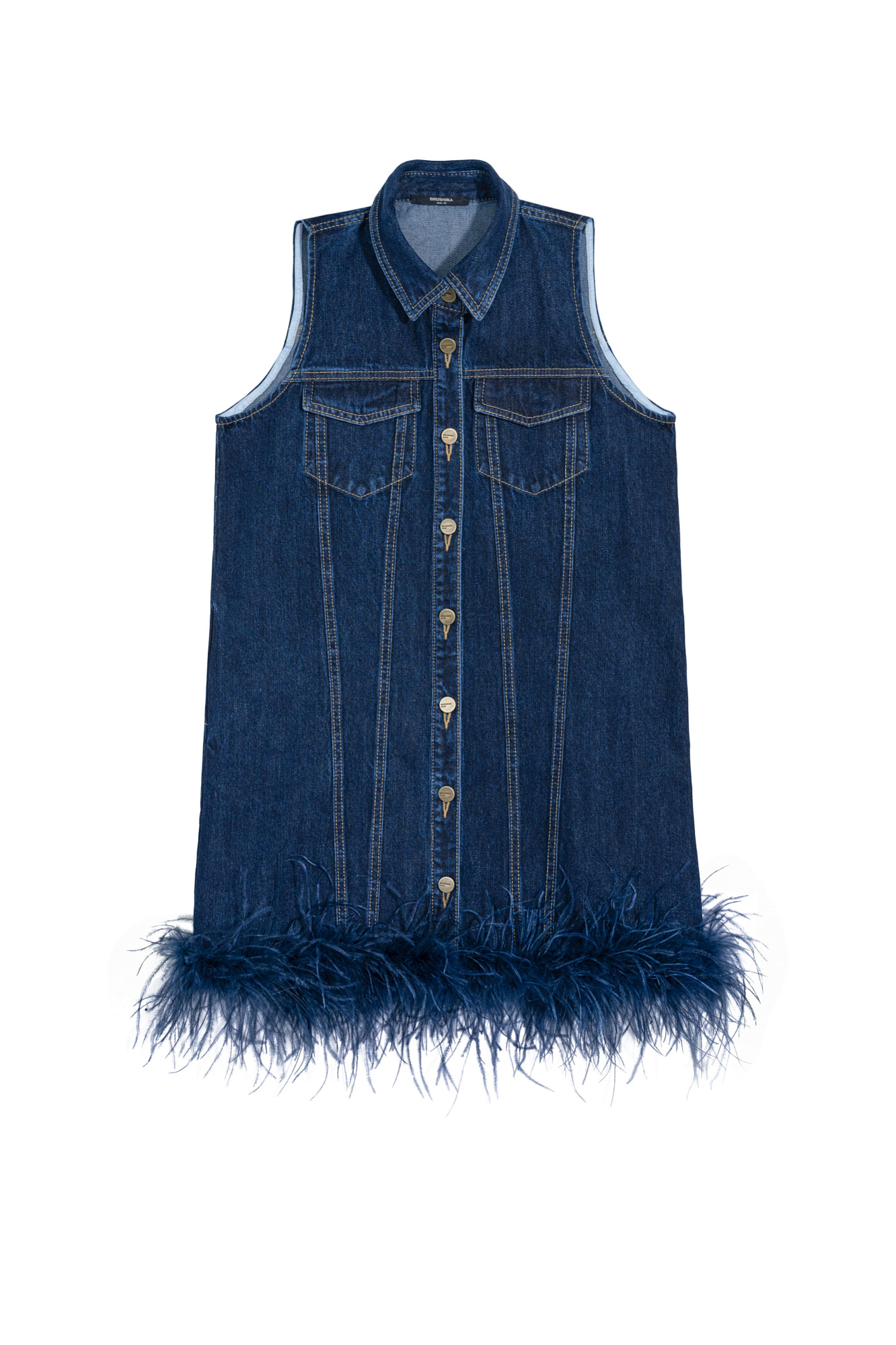 Джинсовое платье длины мини, декорированное лентой со страусиными перьями. Лента с перьями отстегивается. Модель с отложным воротником, без рукавов. Застежка изделия на пуговицы.