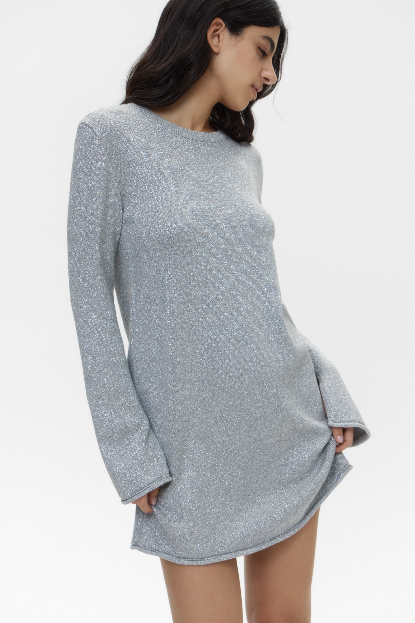 Трикотажное платье длины мини из вискозы с добавлением люрекса. Модель свободного силуэта с круглой горловиной и закрученным краем.