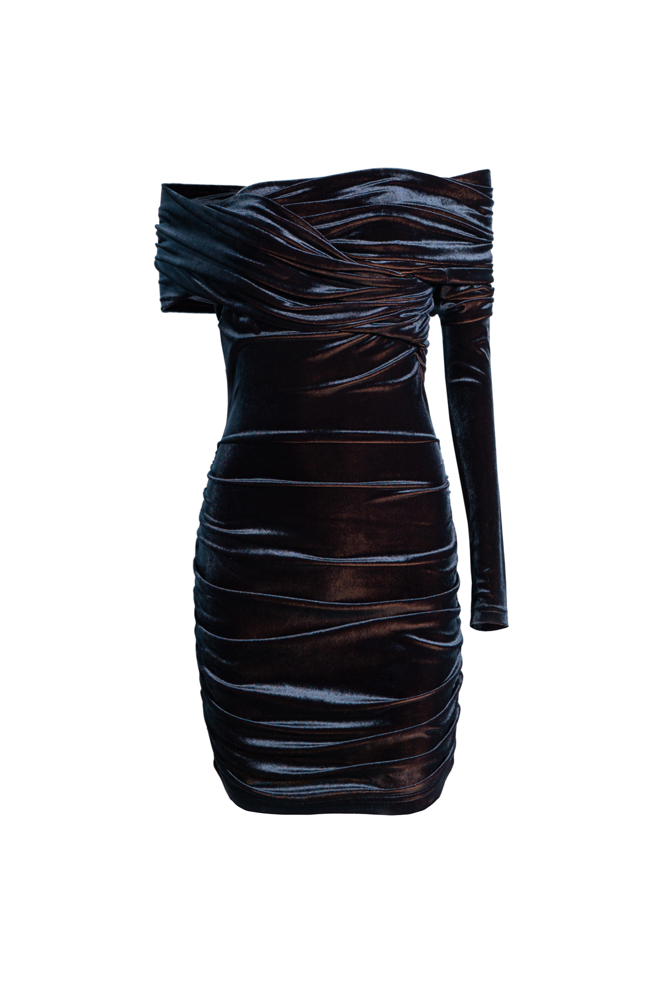 Платье из велюра длины мини. Модель приталенного силуэта с открытой линией плеч и одним рукавом. Изделие декорировано драпировкой. Благодаря необычной текстуре ткани достигается эффект перелива цвета.