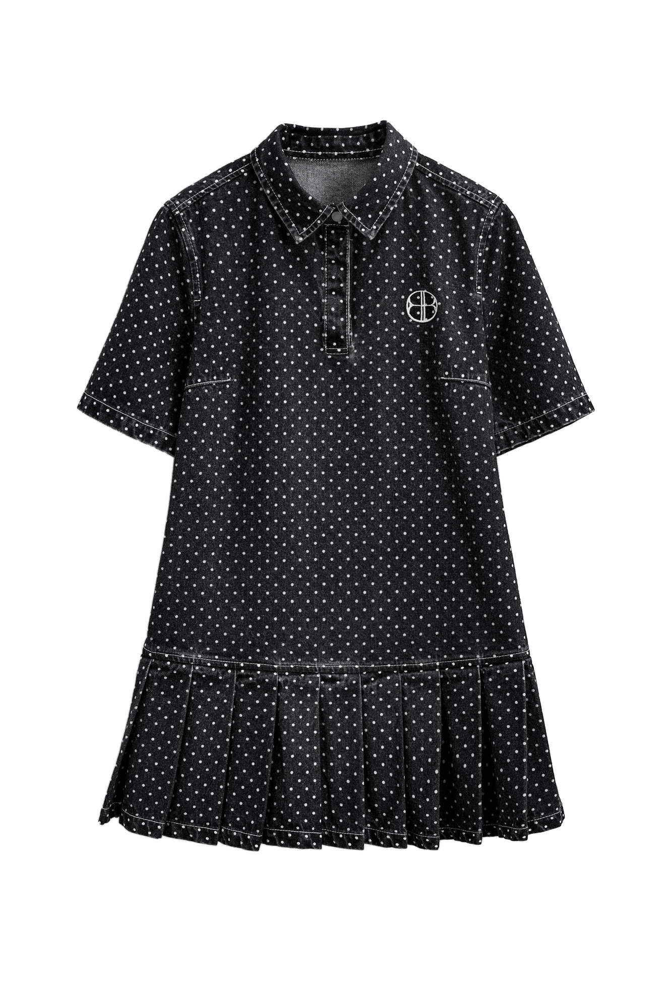 Джинсовое мини-платье в горошек. Отложной воротник с застежкой на магнитных кнопках. Короткие рукава. Расклешенный подол с юбкой плиссе.