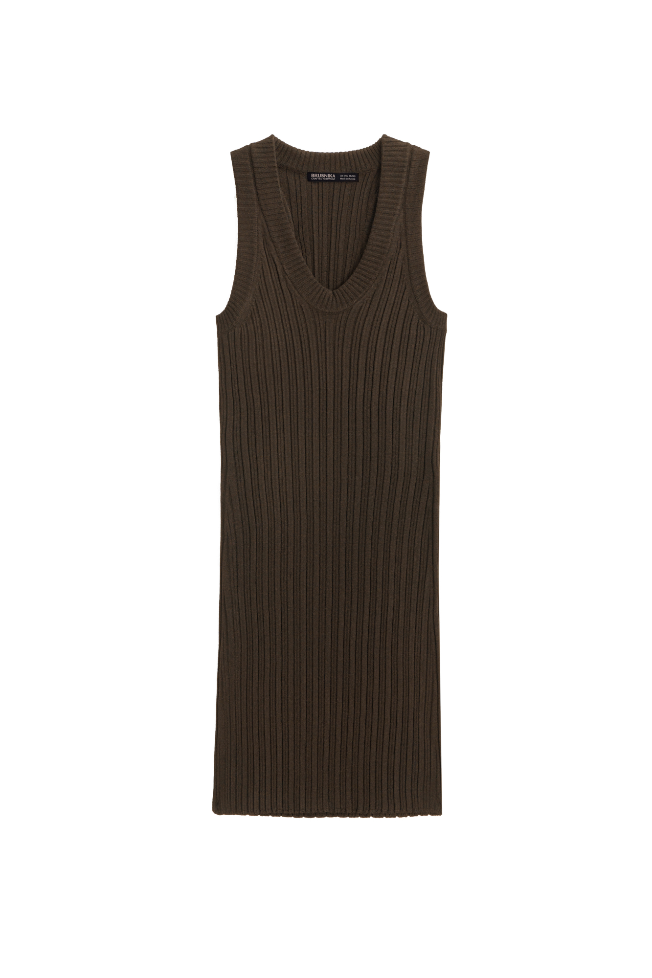 Платье длины мини из фактурного трикотажа на основе вискозы. Модель приталенного силуэта, без рукавов, на широких бретельках, с U-образным вырезом горловины. Изделие выполнено в широкий рубчик.