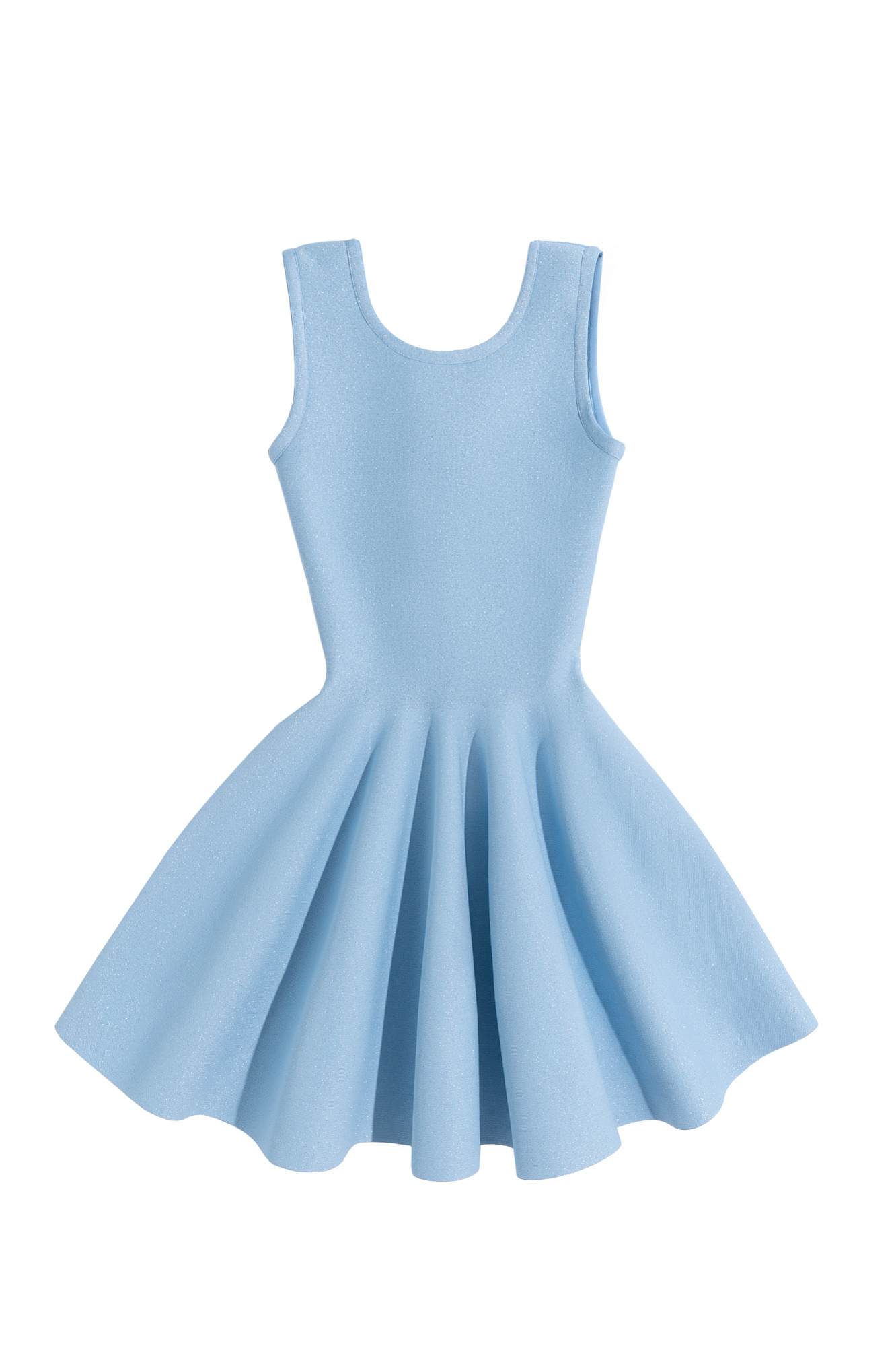 Трикотажное платье длины мини с люрексом. Модель по фигуре с юбкой, расклешенной от талии, без рукавов, на широких бретельках.