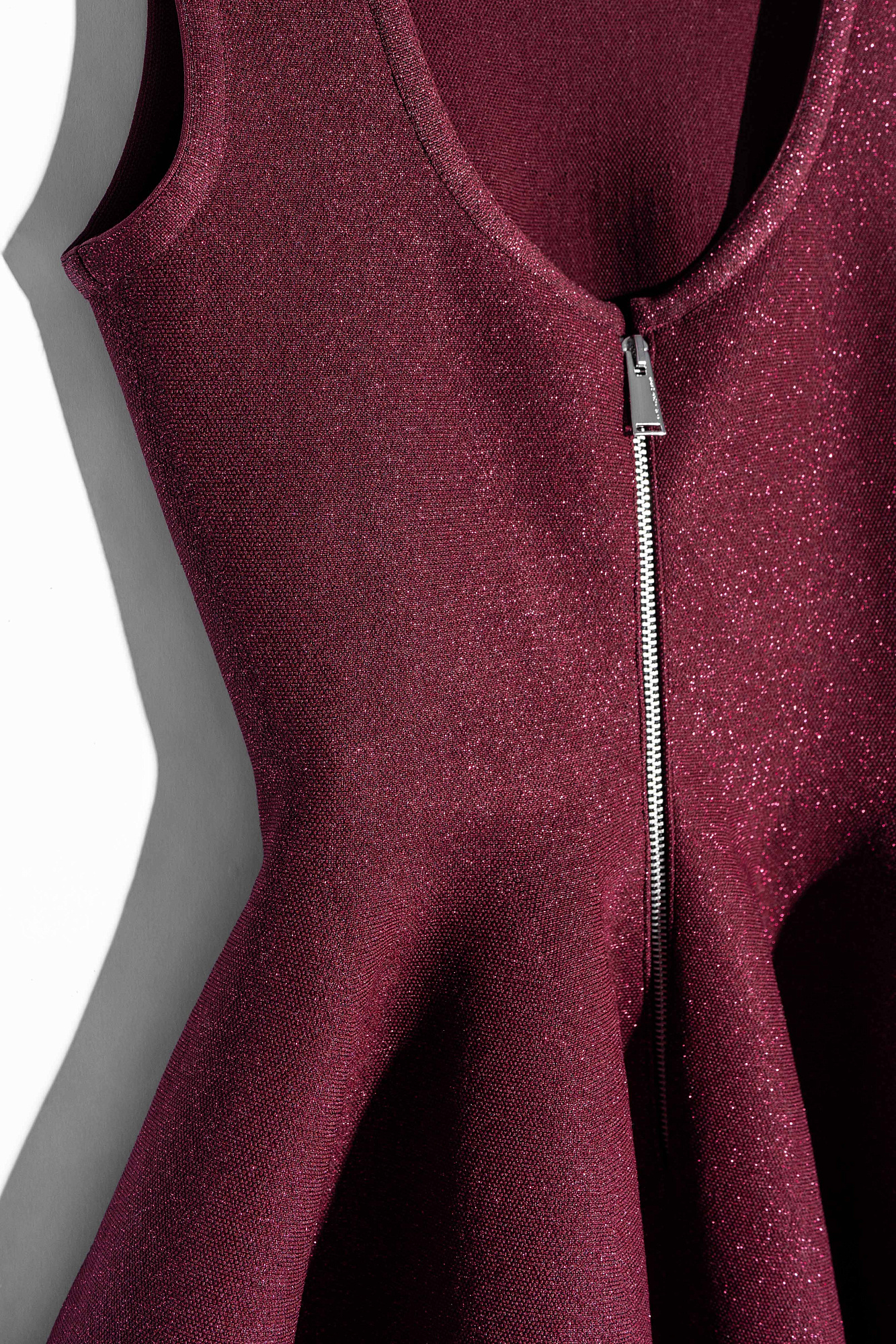 Трикотажное платье длины мини с люрексом. Модель по фигуре с юбкой, расклешенной от талии, без рукавов, на широких бретельках.
