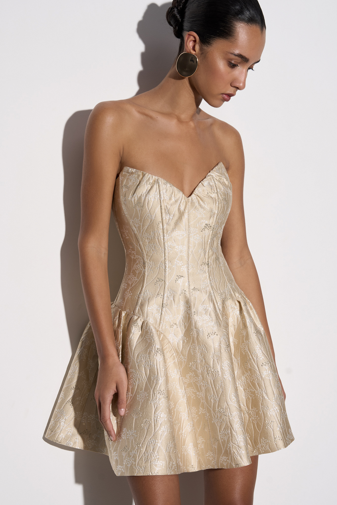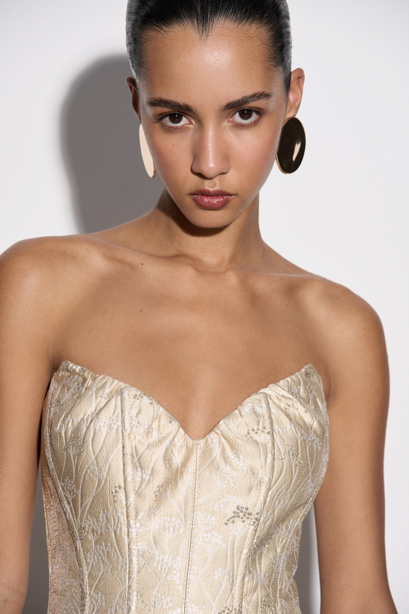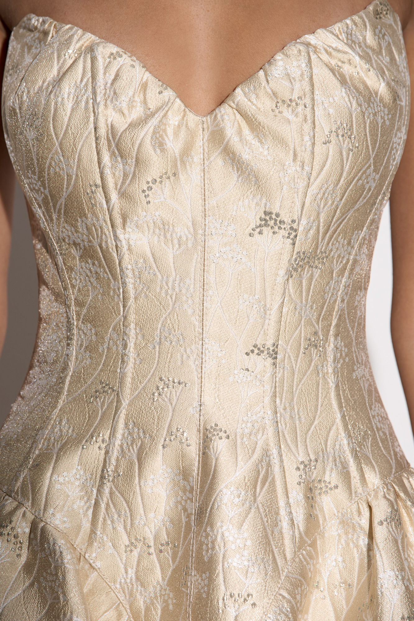 Корсетное платье длины с с растительным орнаментом. Модель прилатенного силуэта с объемной юбкой и фигурным вырезом декольте. Застежка на молнию сзади. Изделие на подкладке.