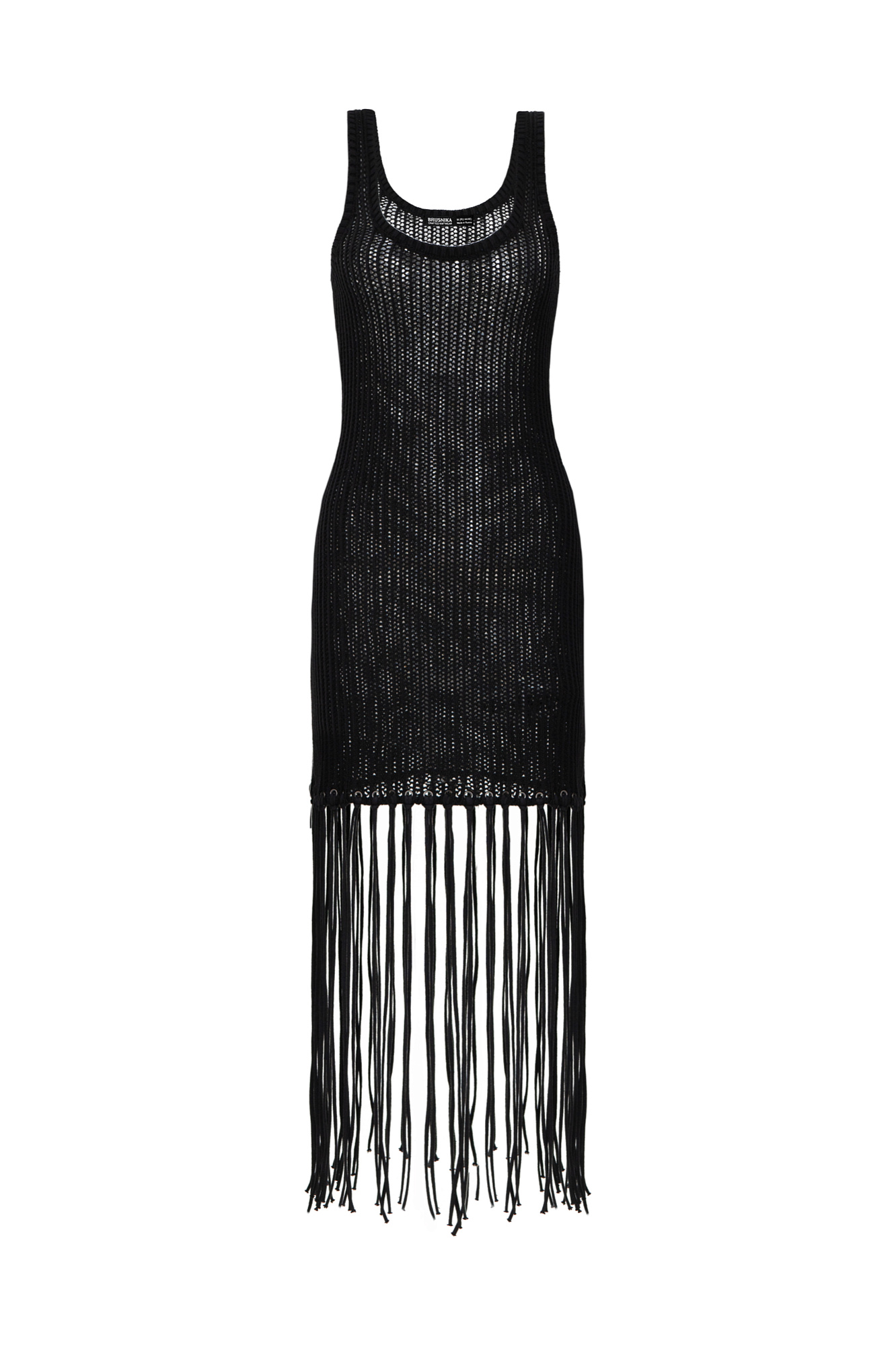 Трикотажный ажурный сарафан из 100% хлопка. Модель свободного кроя, без рукавов, на широких бретельках и U-образным вырезом. Изделие декорировано длинной бахромой.