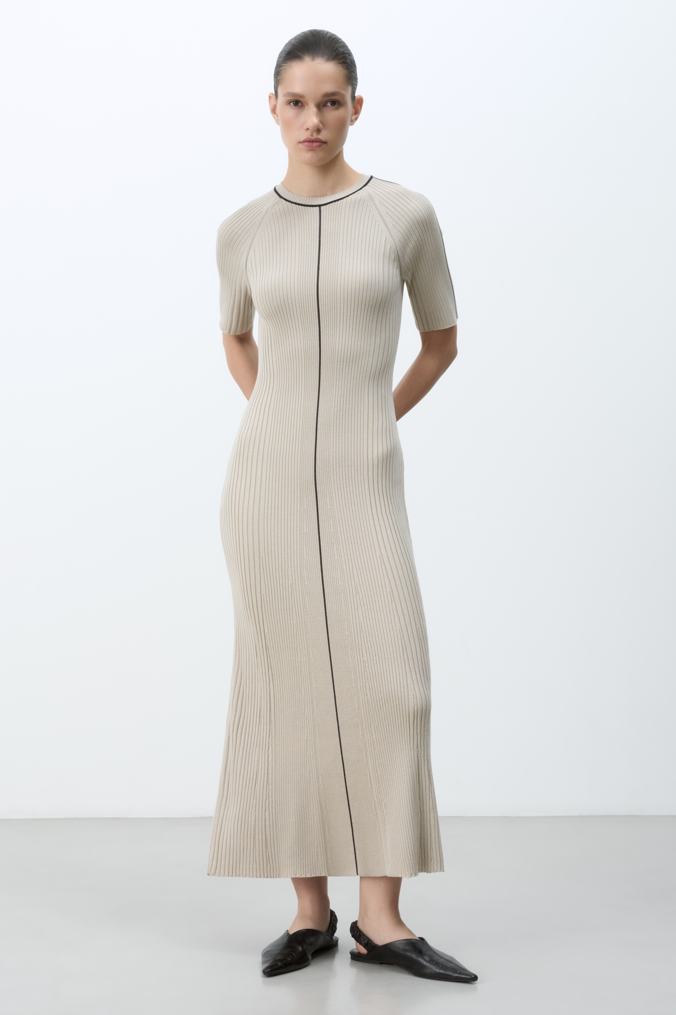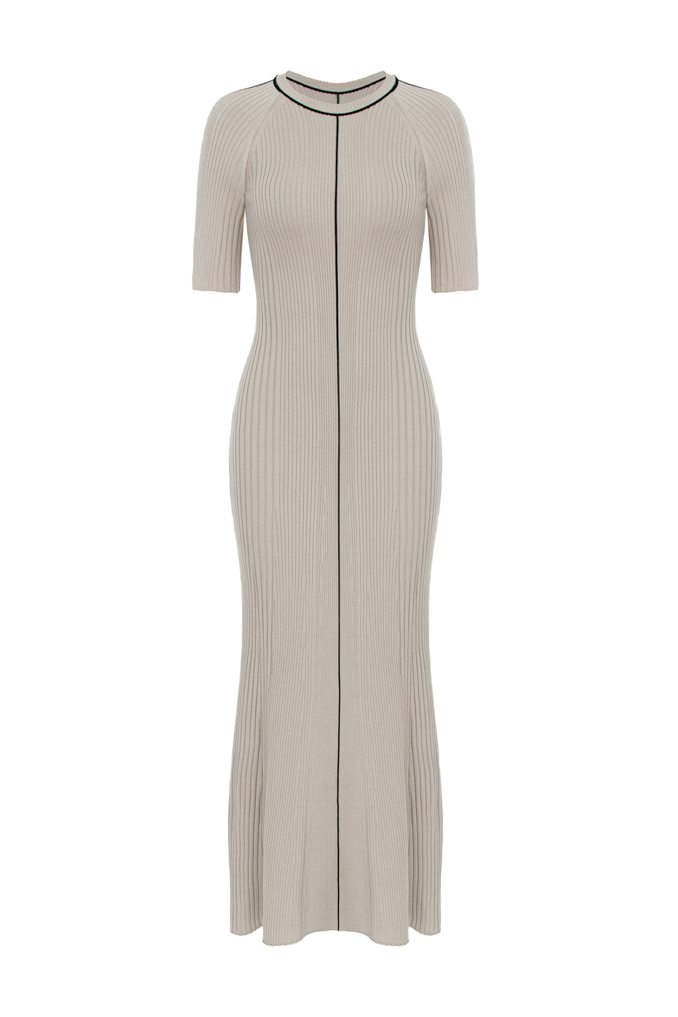 Трикотажное платье макси из шерсти мериноса. С коротким рукавом и контрастной полосой посередине. Модель приталенного силуэта в рубчик.