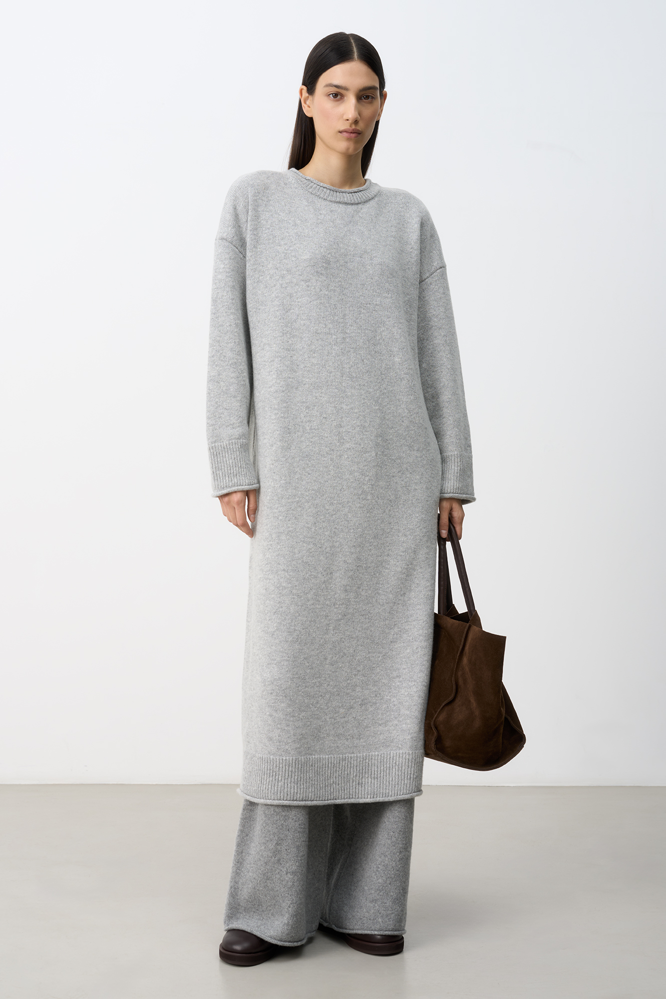Трикотажное платье длины макси из смесовой шерсти с добавлением кашемира. Модель свободного силуэта со спущенной линией плеча и карманами. Края изделия выполнены в рубчик. Брендированный ярлык на спине.