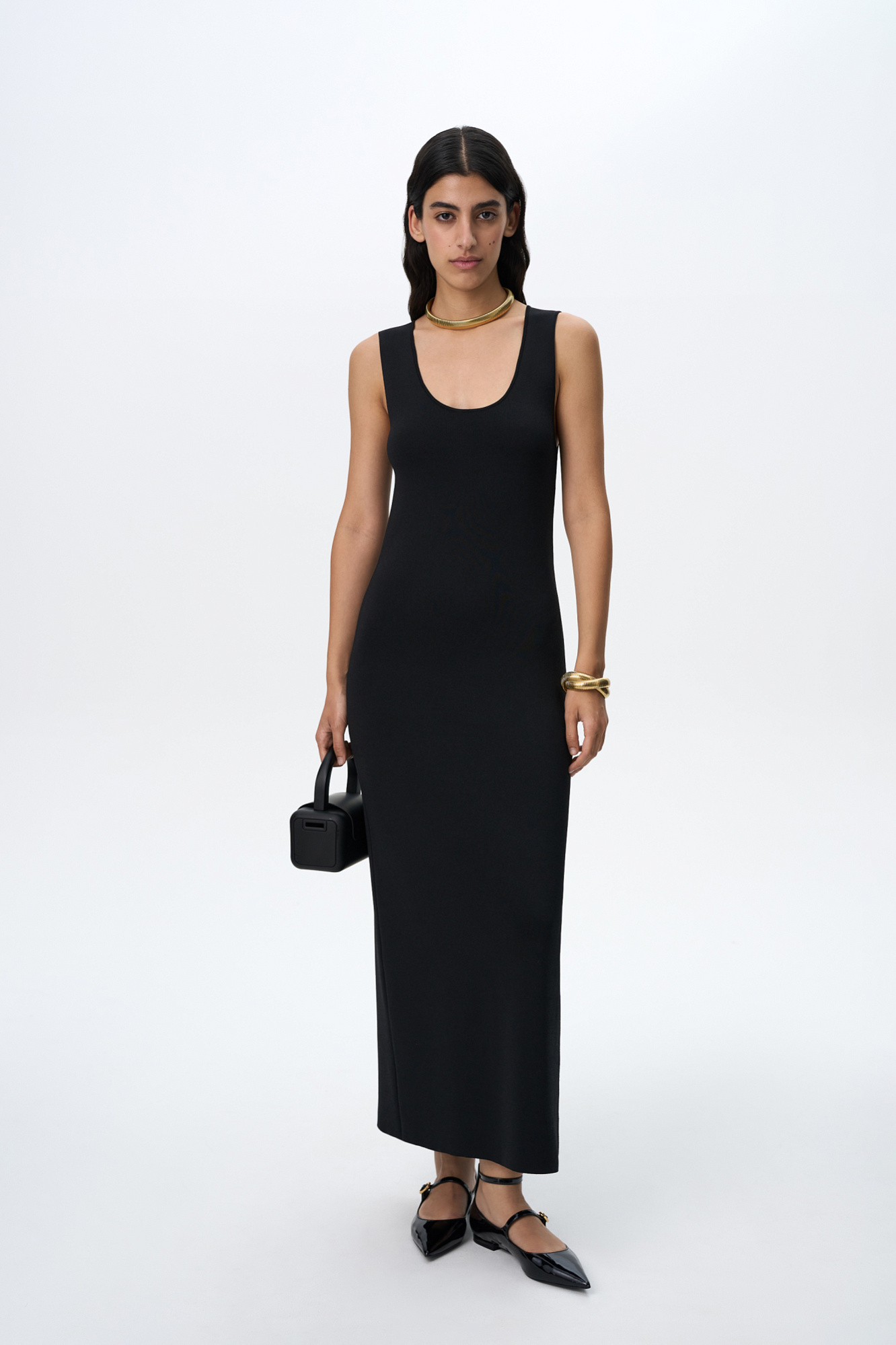 Трикотажное платье с разрезом сбоку. Модель прямого силуэта длины макси.