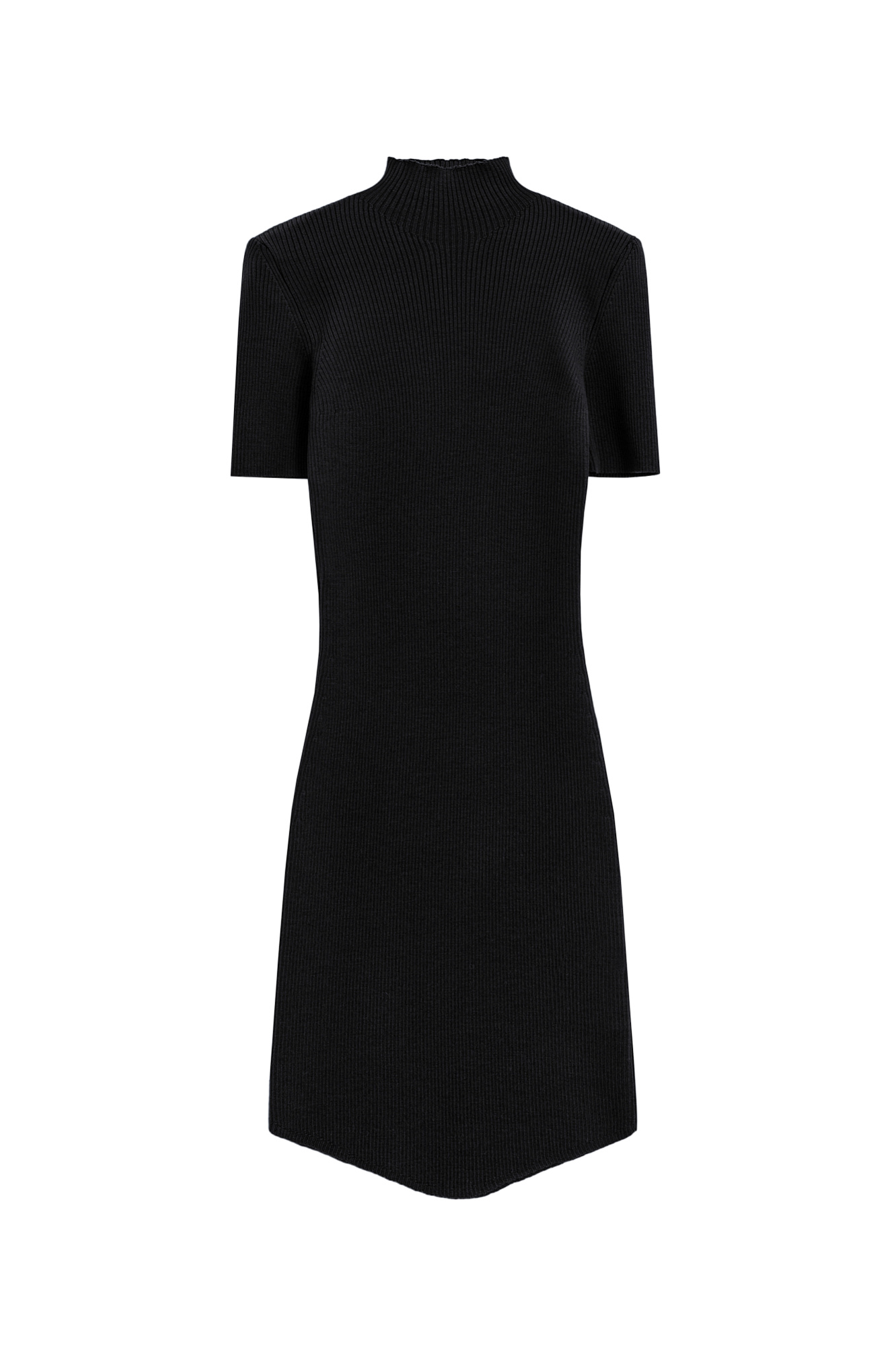 Трикотажное платье длины мини из вискозы с добавлением шерсти. Модель приталенного силуэта с коротким рукавом, невысоким воротником и арочным низом. Изделие выполнено в рубчик.