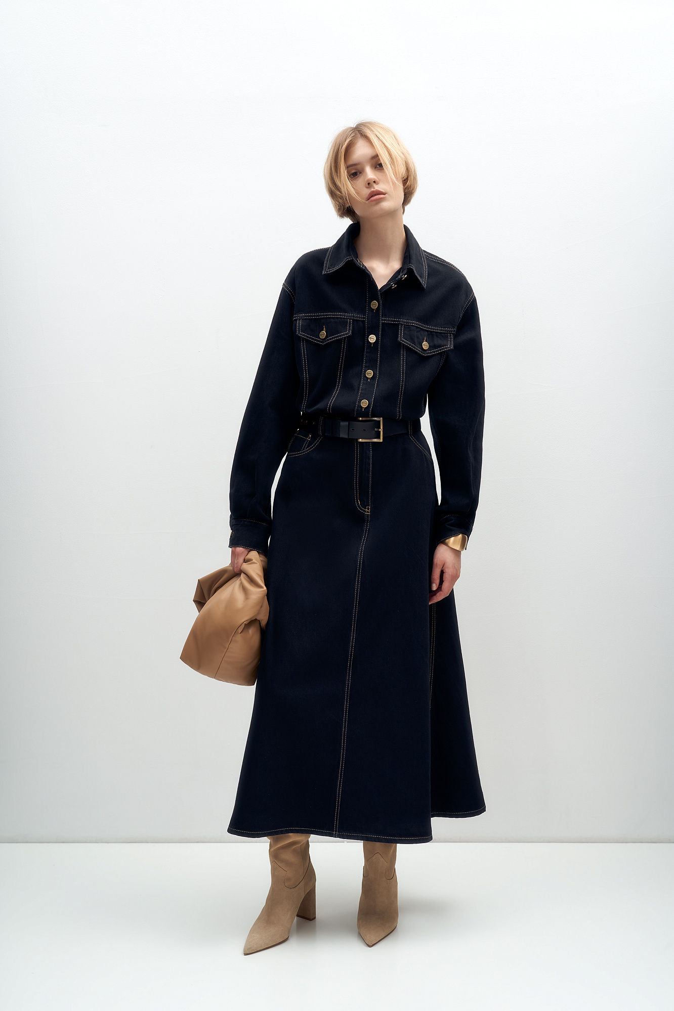 Джинсовое платье из 100% хлопка с рубашечнымм верхом и юбкой А-силуэта. Модель с длинными рукавами с манжетами, отложным воротником, карманами на груди с клапанами, шлевками на поясе для ремня, боковыми и задними карманами. Застежка на металлические пуговицы. Изделие декорировано вытачками контрастного цвета.