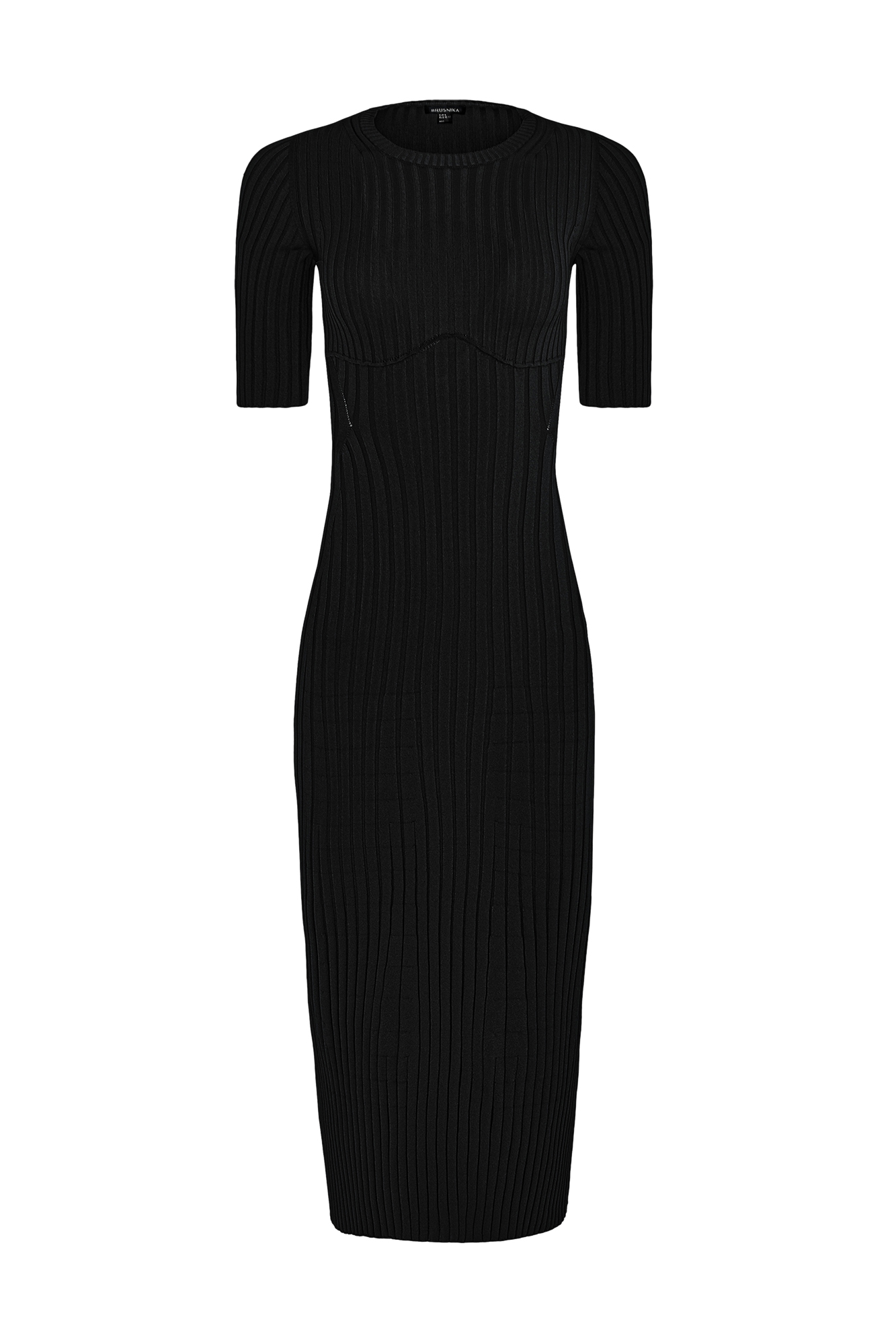 Облегающее трикотажное платье с открытой спиной и короткими рукавами не оставит равнодушным никого. Элегантный и утончённый образ обеспечивает длина миди, а текстура в рубчик визуально вытягивает силуэт.